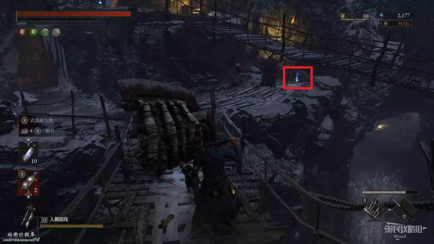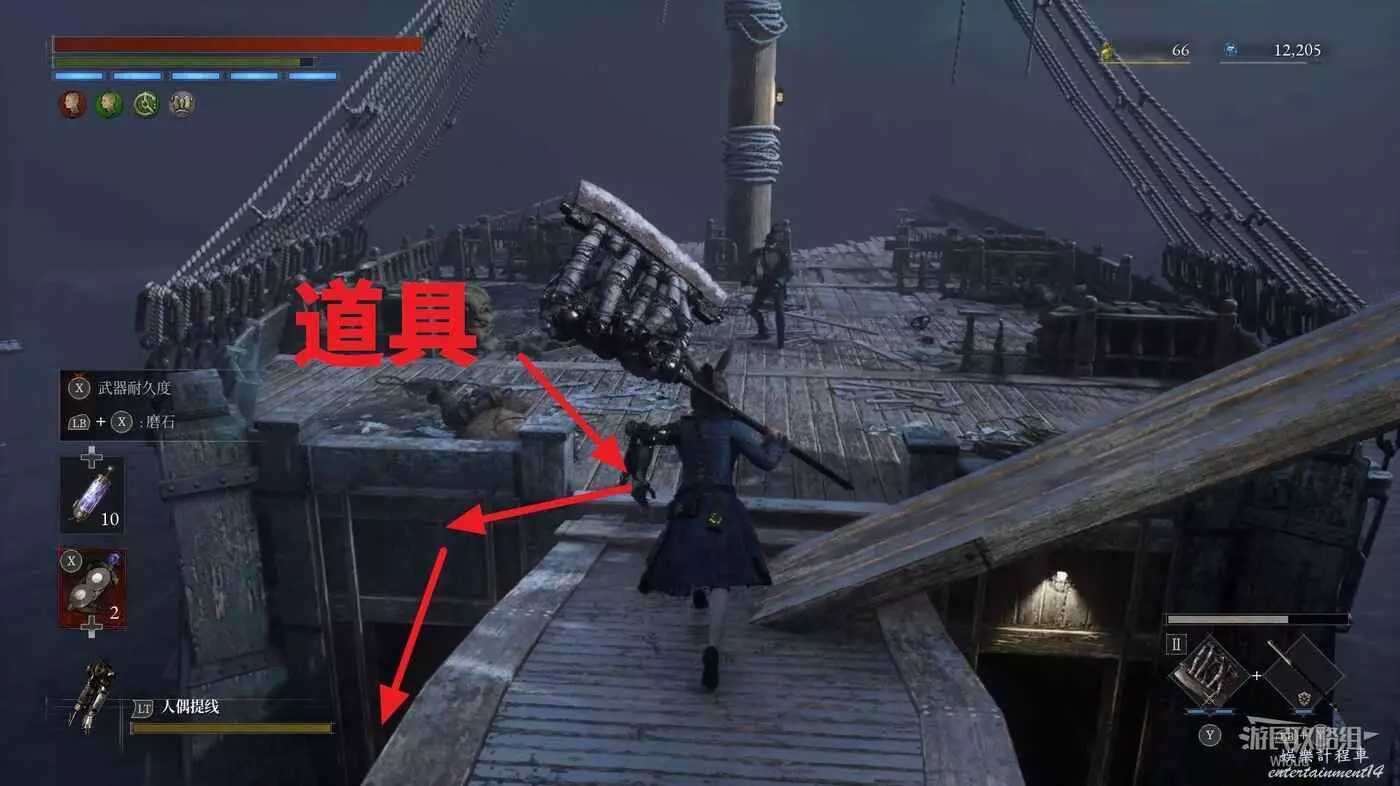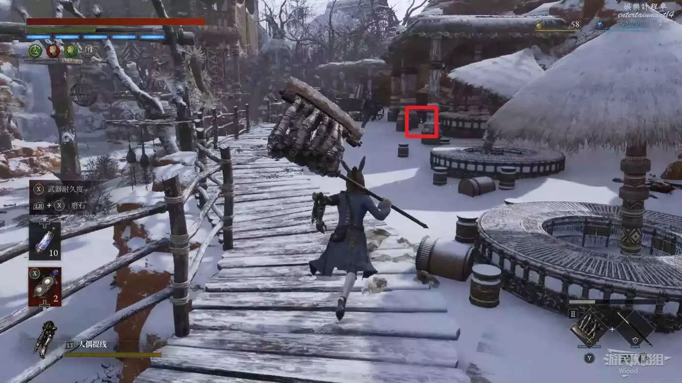 回到中間位置往前走一段朝右看,右側木橋口有個道具可拿,沿著木橋走到斷口處也有個道具可拿。