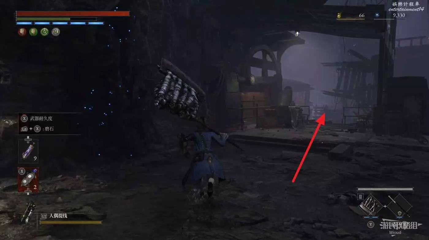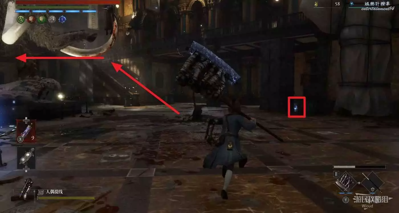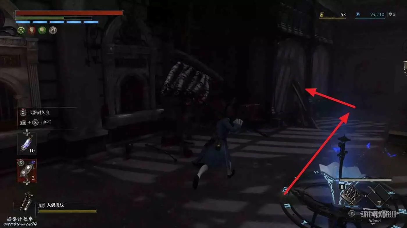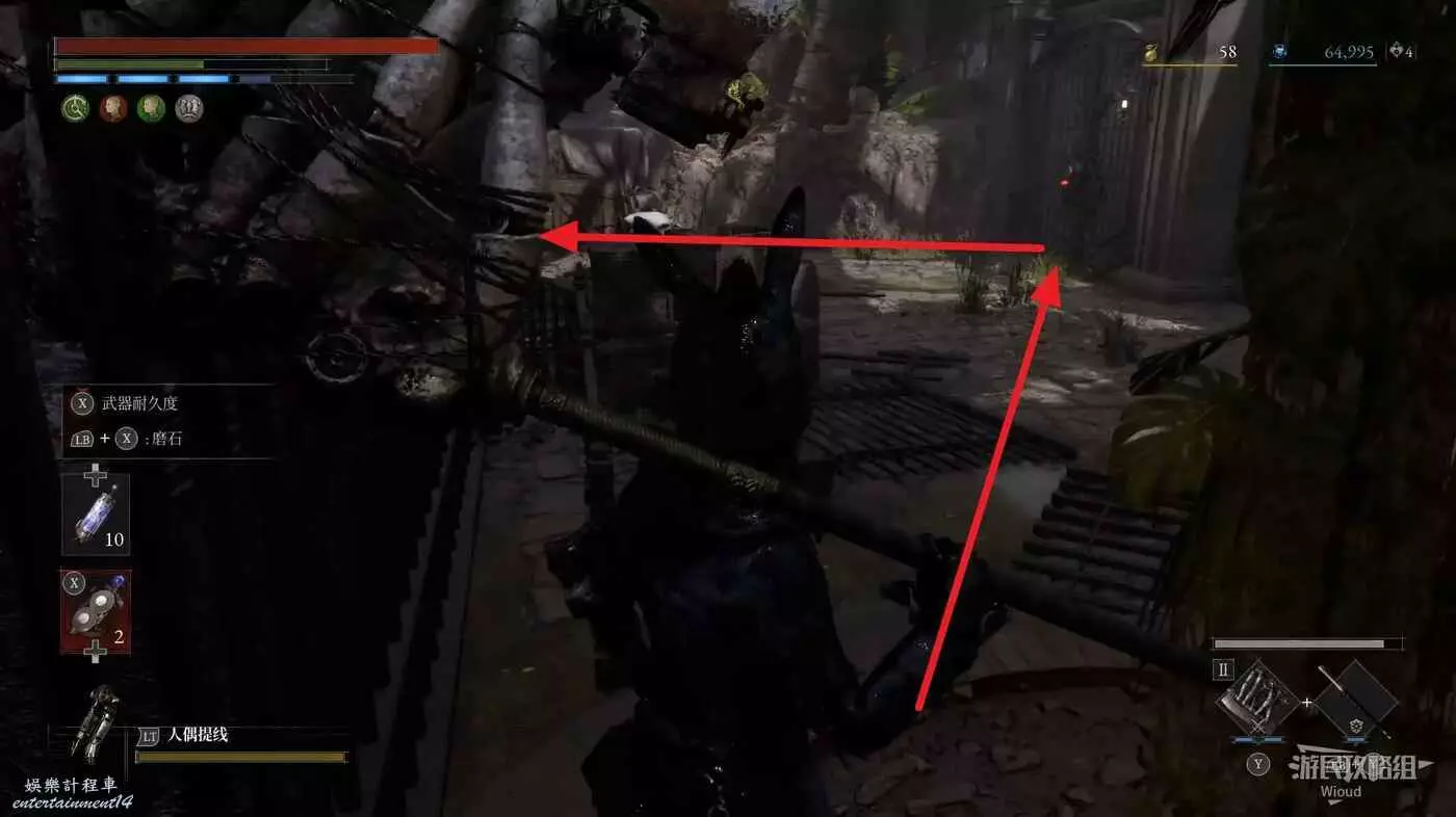 跳到下方沿著下圖箭頭所示,繞到右側高台,當我們移動到盡頭木箱前會突然蹦出一個怪物,此處可以撿到一個【璀璨自我素碎片】。