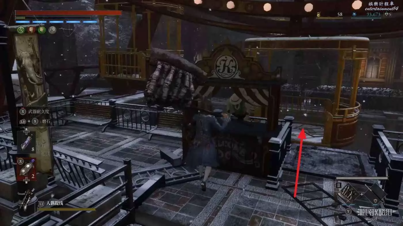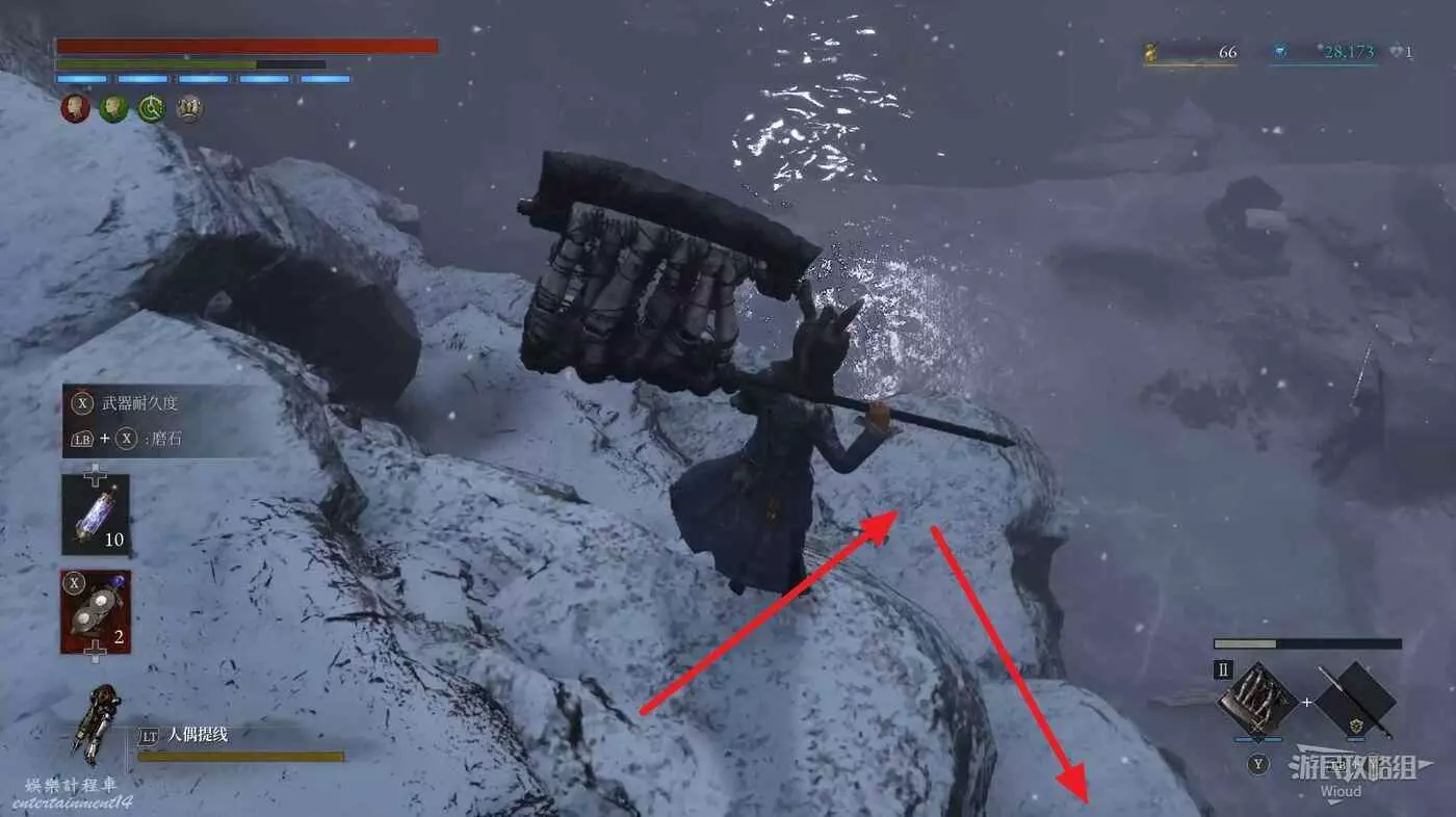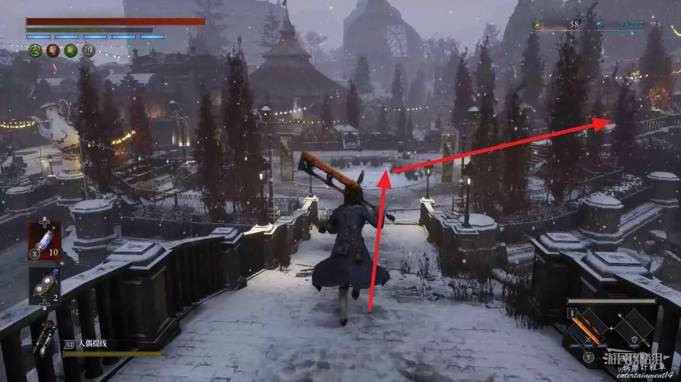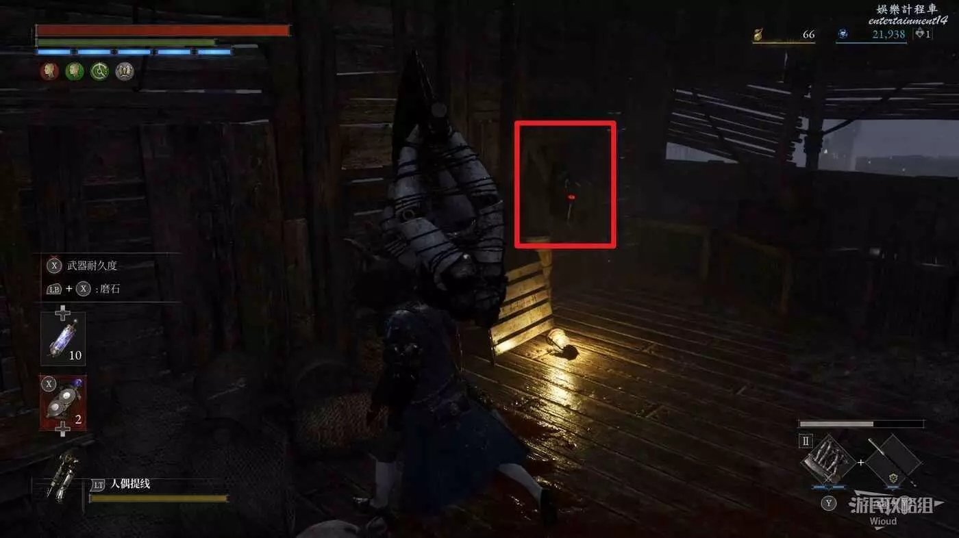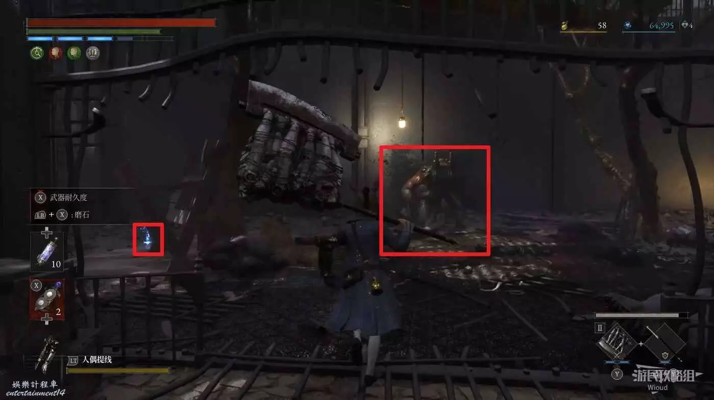跳到下方沿著下圖箭頭所示,繞到右側高台,當我們移動到盡頭木箱前會突然蹦出一個怪物,此處可以撿到一個【璀璨自我素碎片】。