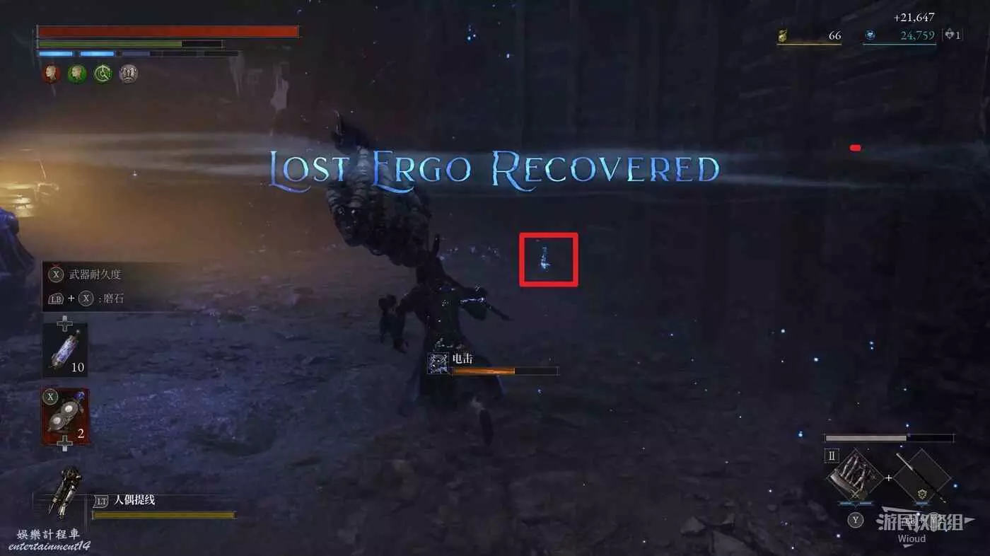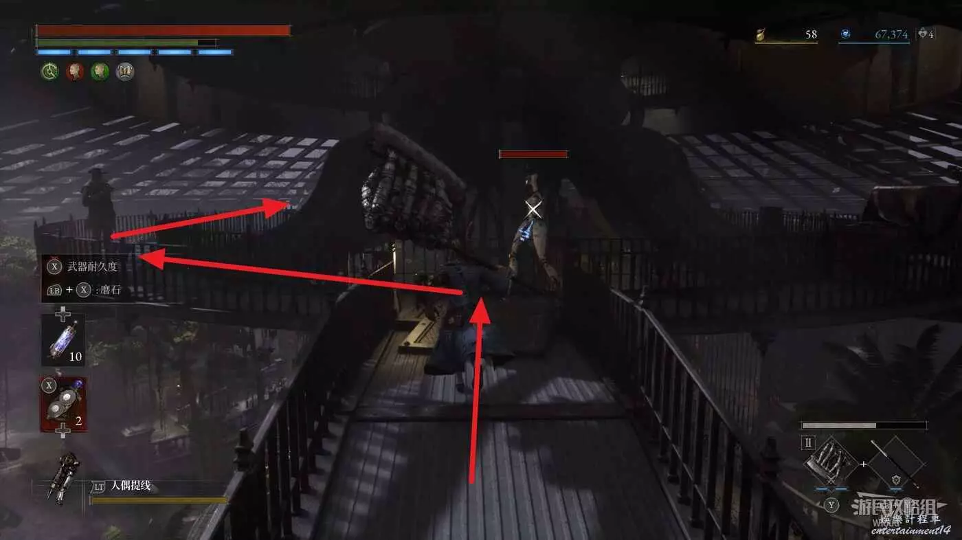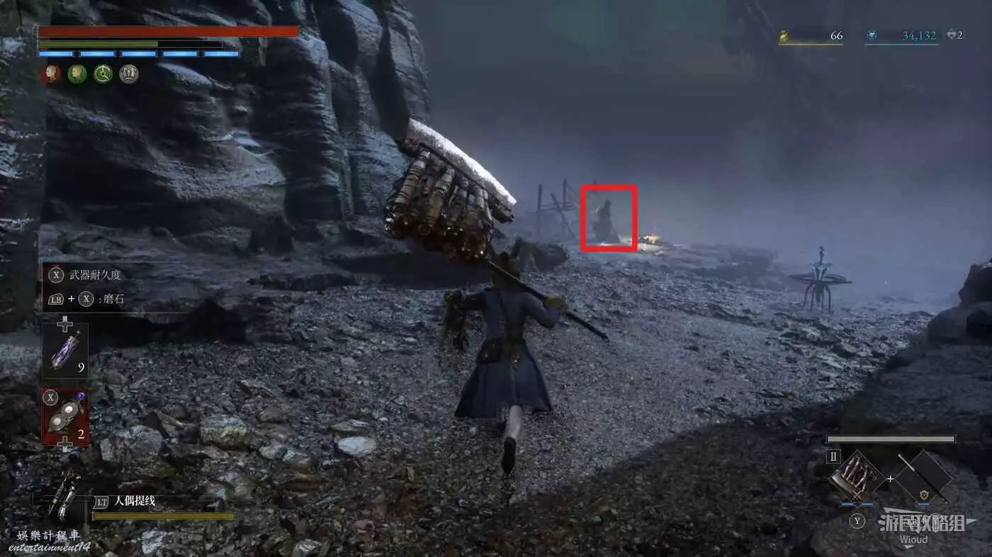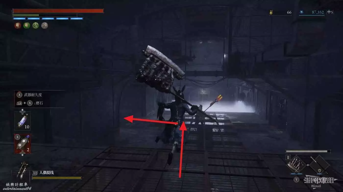 跳到下方沿著下圖箭頭所示,繞到右側高台,當我們移動到盡頭木箱前會突然蹦出一個怪物,此處可以撿到一個【璀璨自我素碎片】。