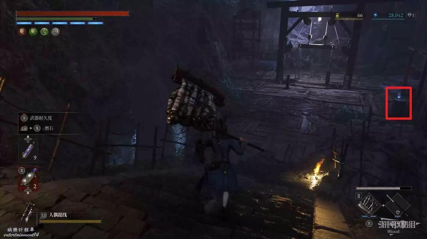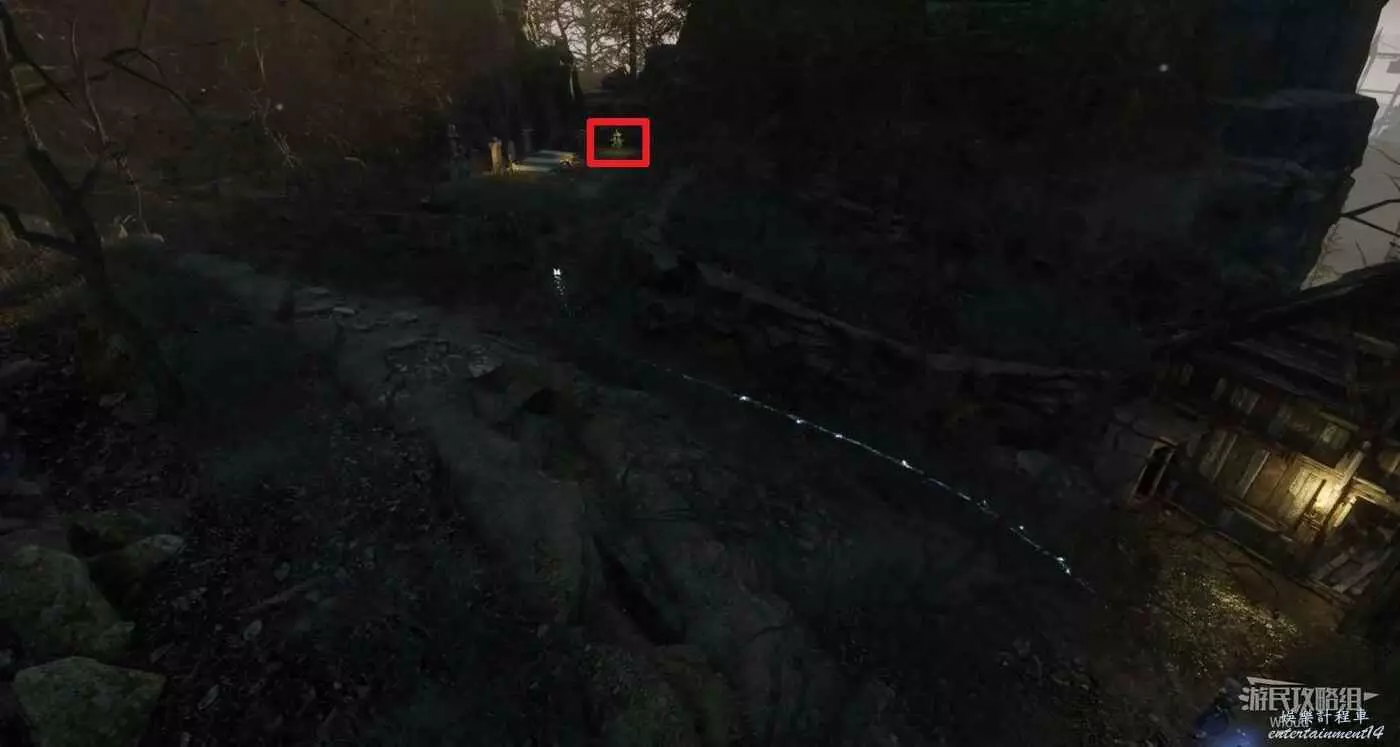 篝火處往前走,拐彎處右側木箱子可以撿到一個【超凡強化安瓶】。