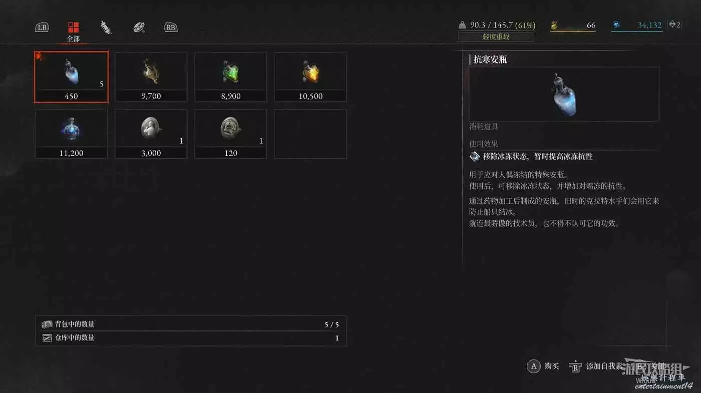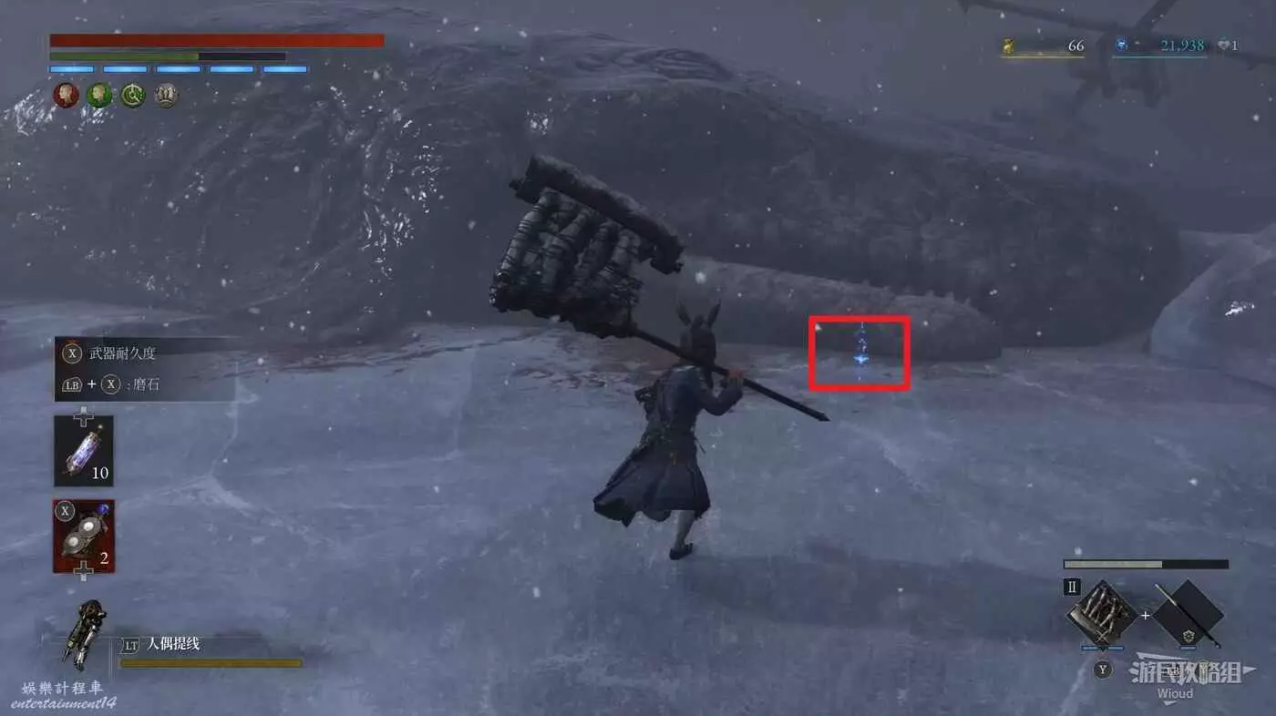 開啟通往冒險大廳篝火的近路後轉頭看向後方全是籠子的開闊區域,左側全是冰塊的牆壁處可以撿到一個【屬性抗性安瓶】,注意冰牆壁右側有個入口,記住這個入口但先不進去。