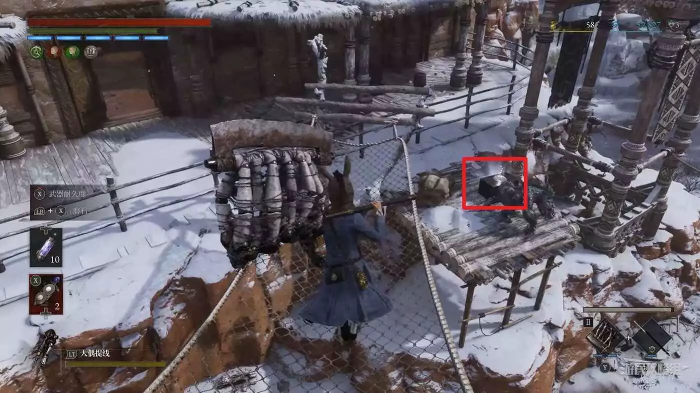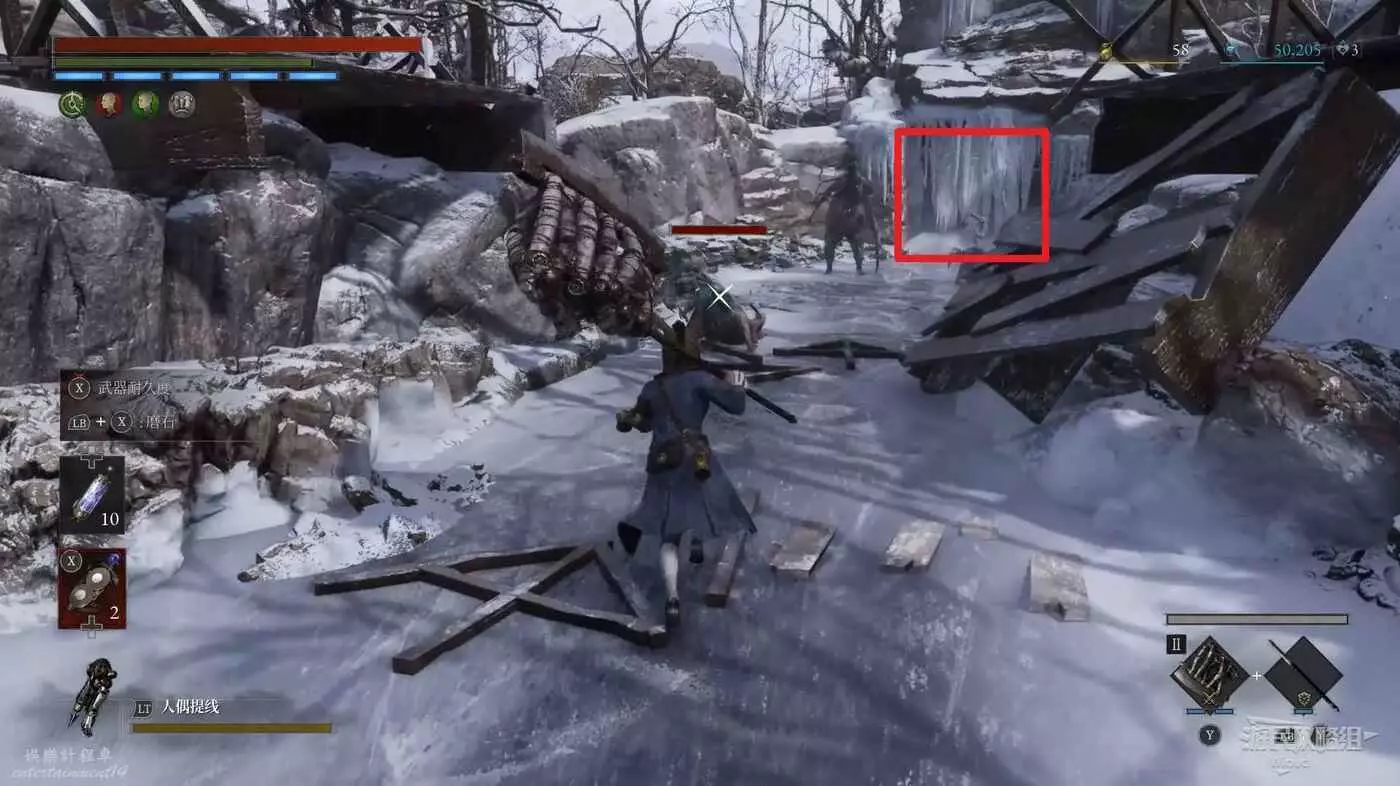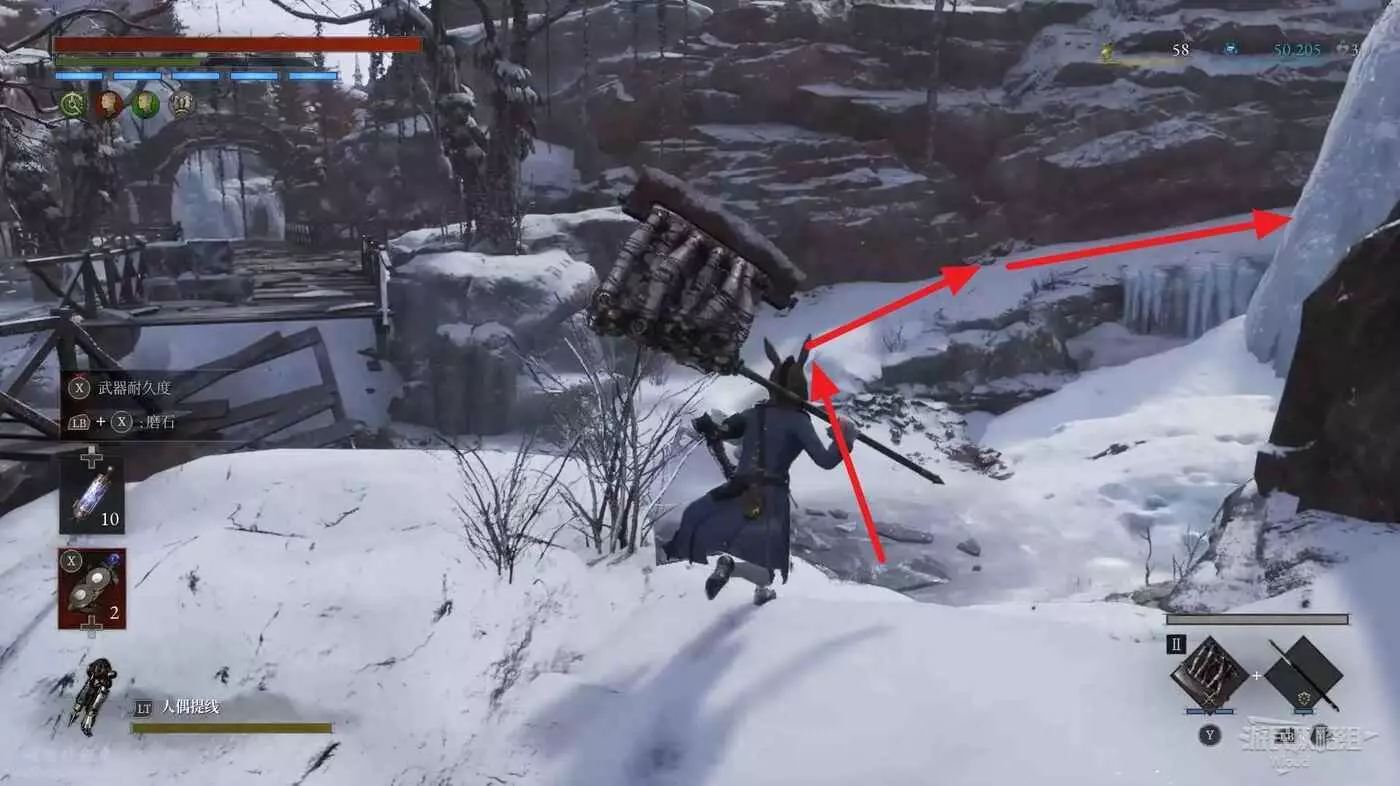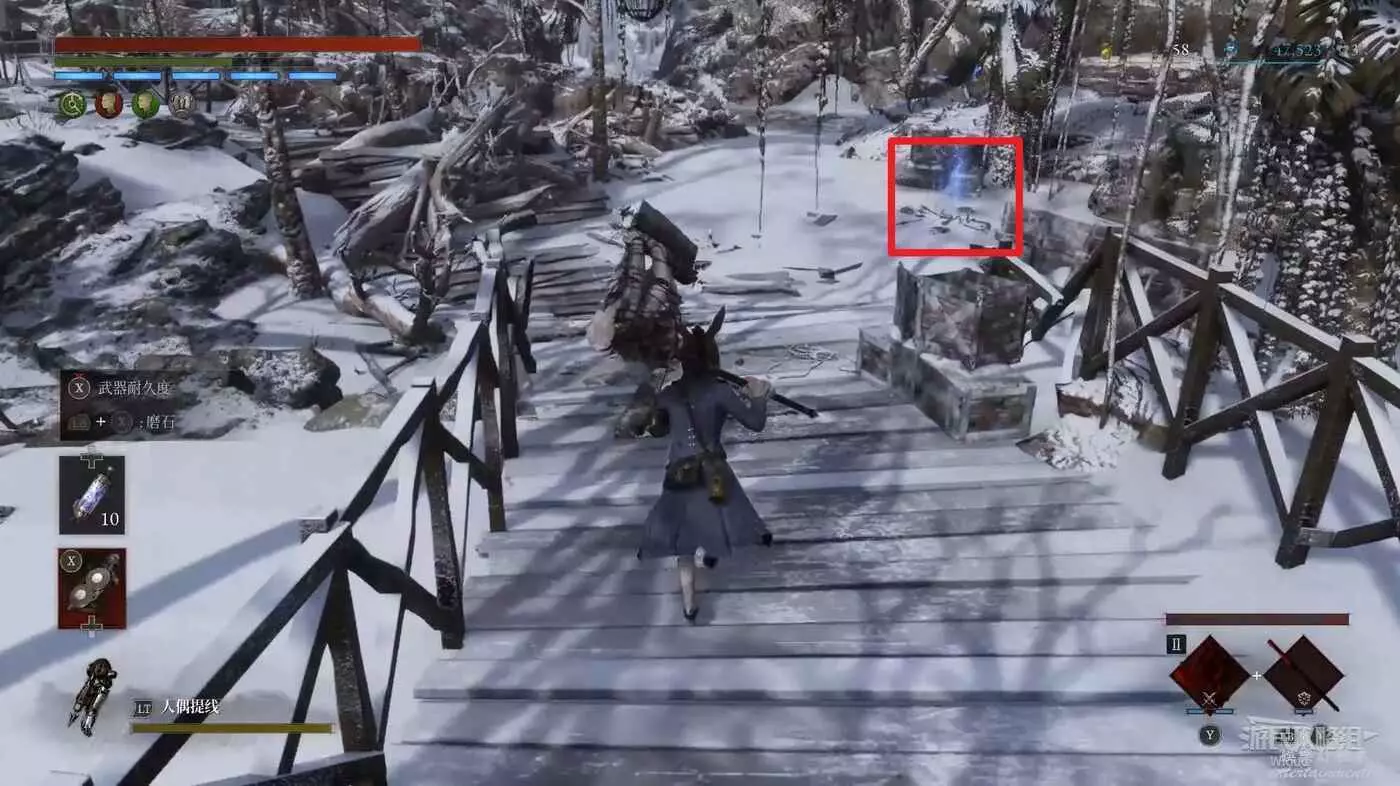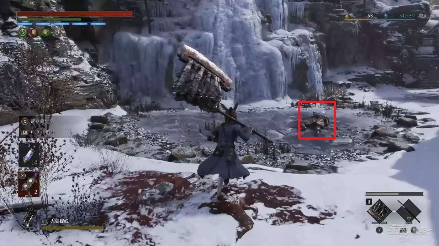 回到之前剛跳下來的位置往左走,盡頭被冰柱擋住的洞口有個寶箱,開啟可獲得武器【洛倫齊尼攻城弩箭頭】與【洛倫齊尼攻城弩握柄】。