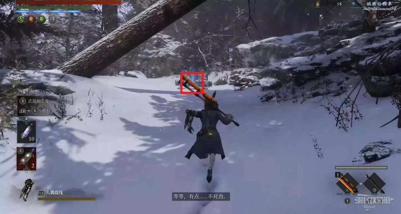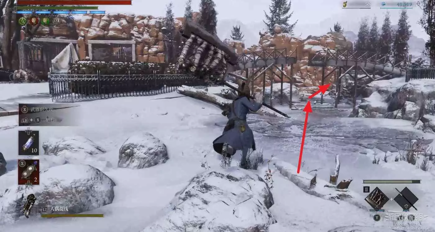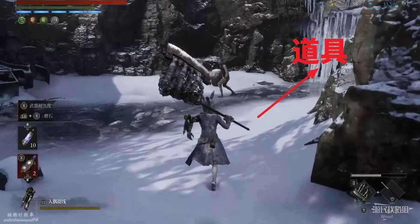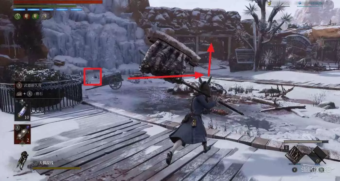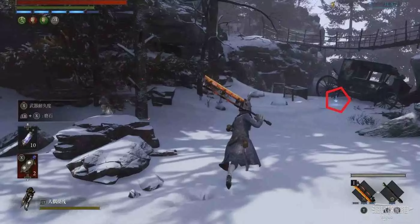 回到之前剛跳下來的位置往左走,盡頭被冰柱擋住的洞口有個寶箱,開啟可獲得武器【洛倫齊尼攻城弩箭頭】與【洛倫齊尼攻城弩握柄】。