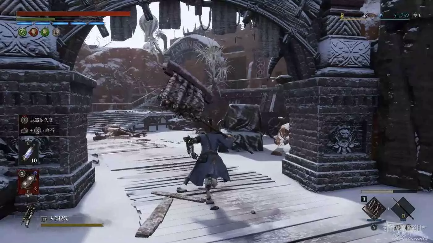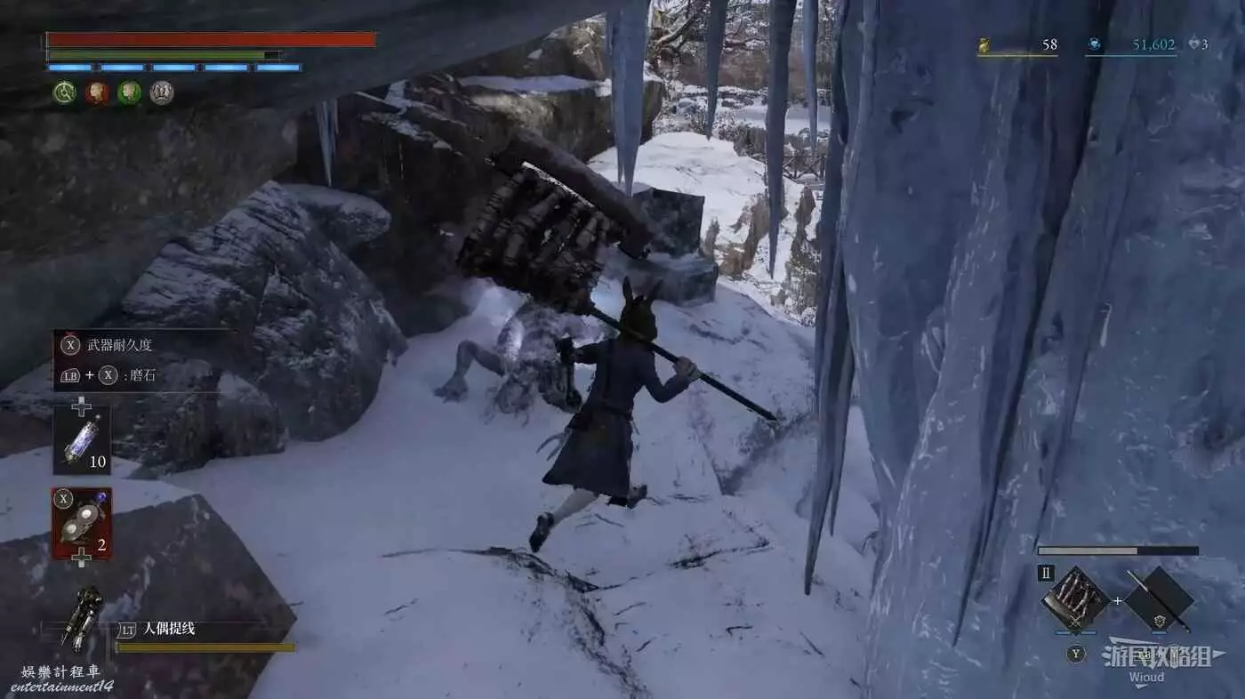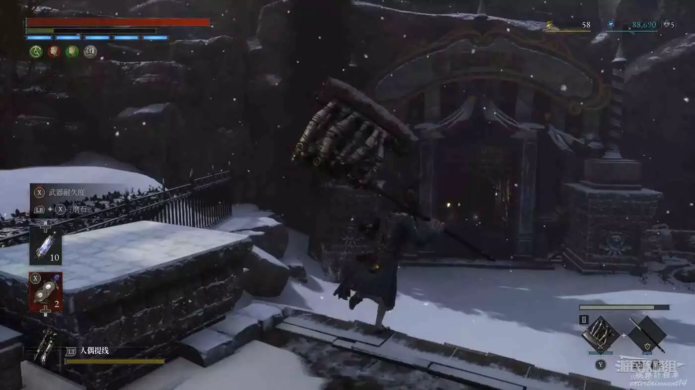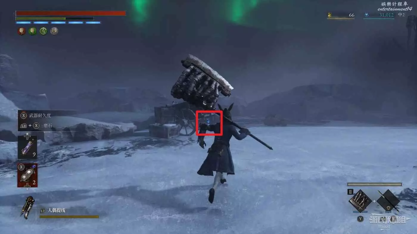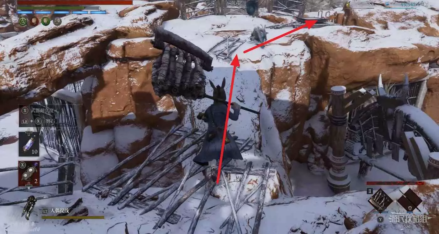 回到之前剛跳下來的位置往左走,盡頭被冰柱擋住的洞口有個寶箱,開啟可獲得武器【洛倫齊尼攻城弩箭頭】與【洛倫齊尼攻城弩握柄】。