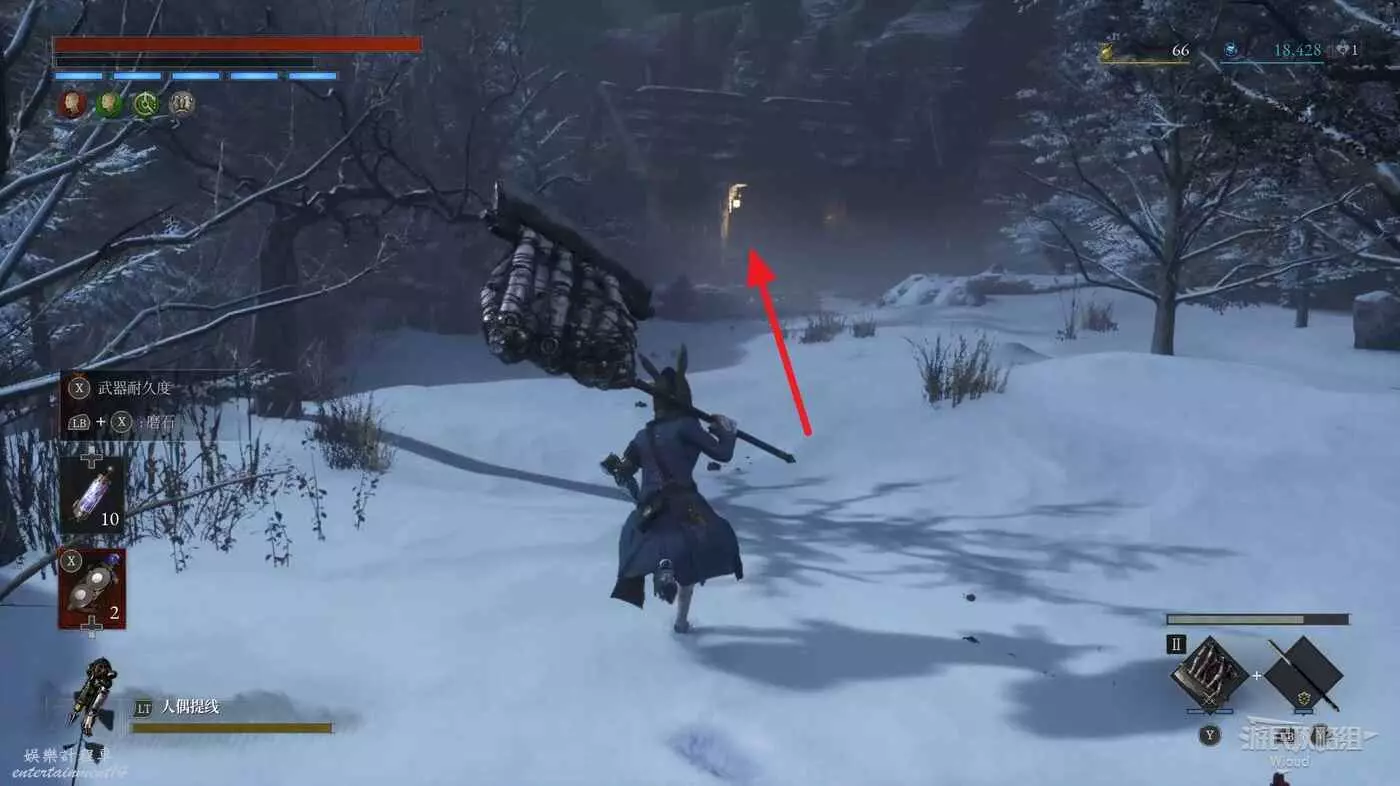 傳送到第三章篝火【古代遺跡發掘點】,沿路往下走,進入下圖所示的近路門。