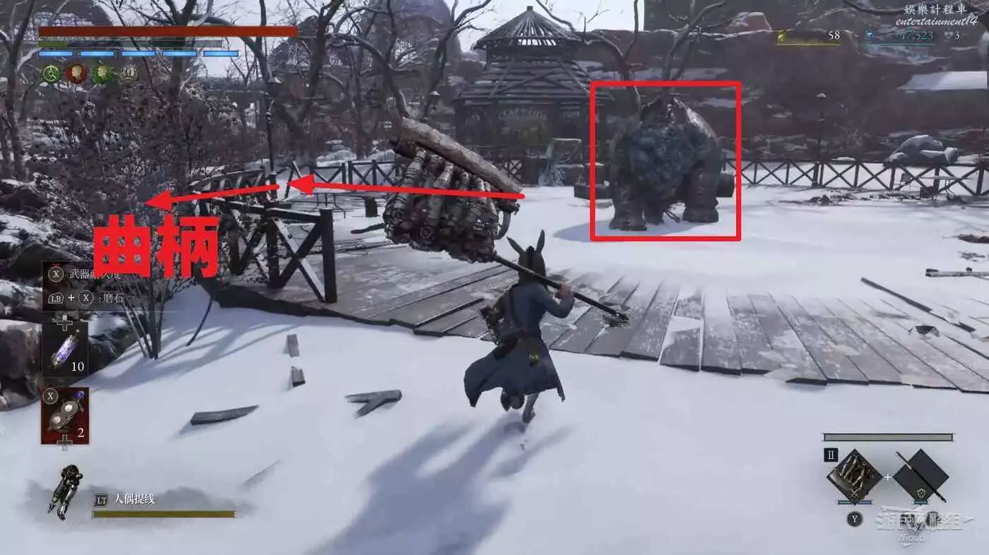 沿路走到一個圓形區域,擊敗此處的大象怪物可獲得一個【天才的軍團插口】,區域入口左側有個小道,盡頭可撿到【平衡曲柄】,入口正對面木箱處可撿到一個【抗寒安瓶】。