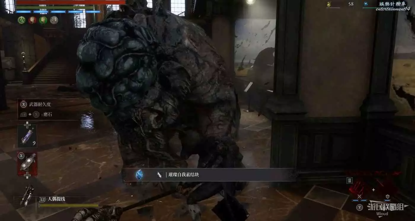 因為前面的路被木箱擋住,繞到大廳右邊,擊敗一個賊肉的大象怪可獲得一個【璀璨自我素結塊】。