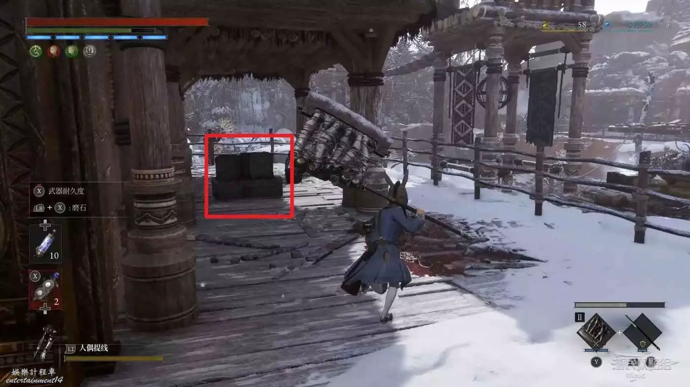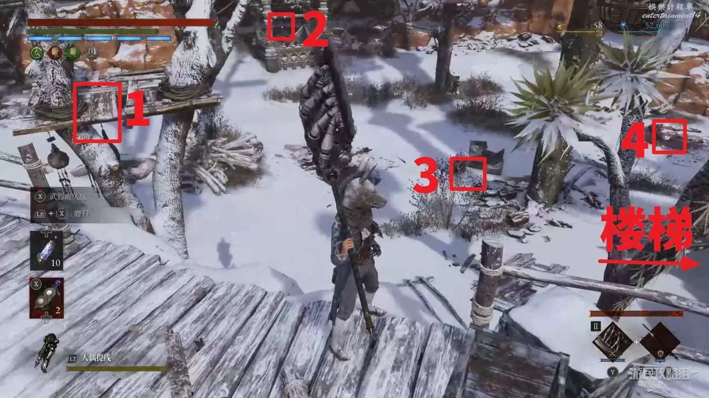 此處左側有個缺口,從缺口跳到下方區域,紅框處可以撿到四個道具,注意紅框1處道具在一個木箱旁邊,因角度問題紅框位置可能無法對應。