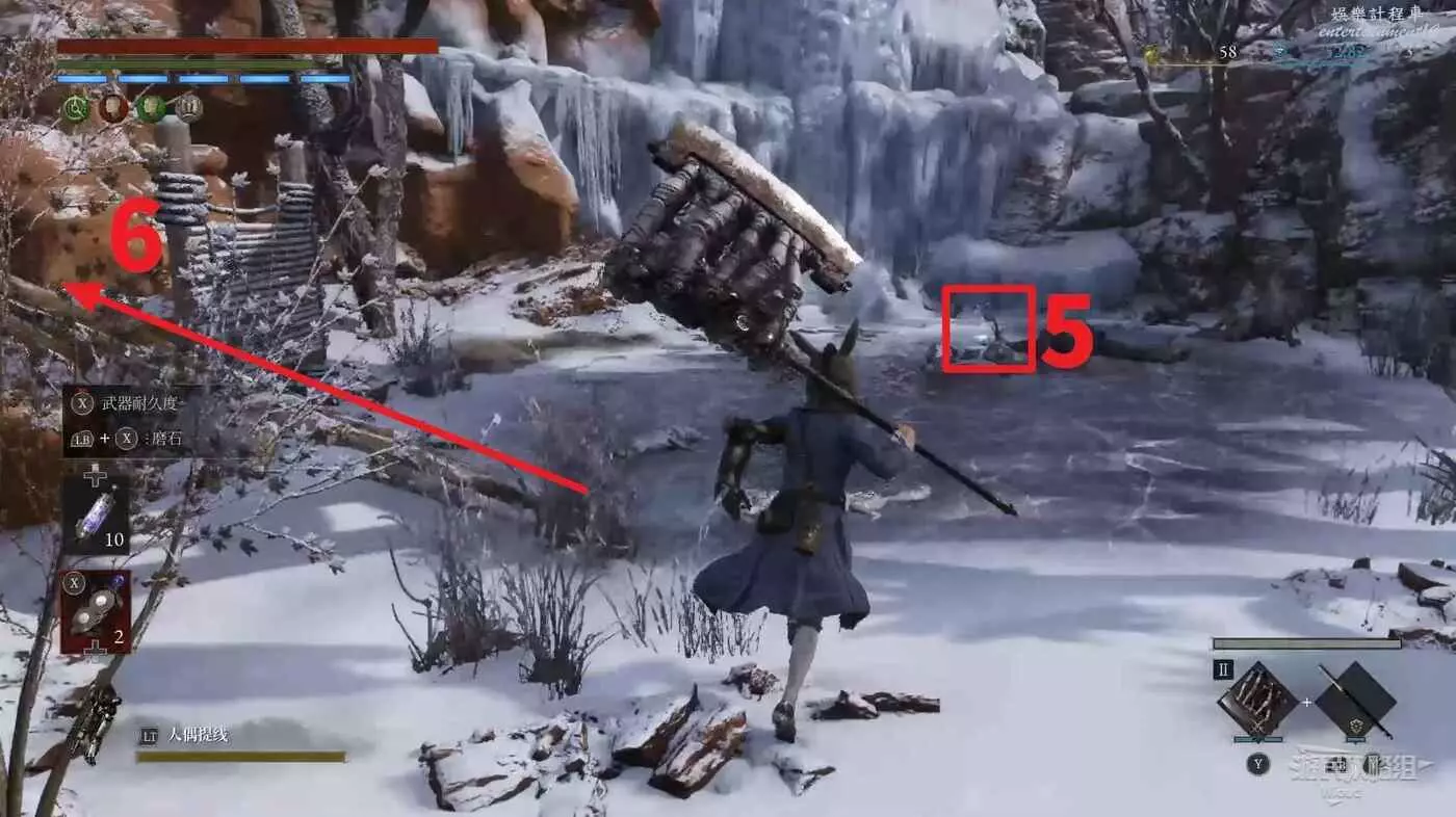 紅框4的位置,前方有個碎冰湖,此處可以撿到【技術曲柄】,沿著左側的木板走到一個小高台,打碎木箱可以撿到【璀璨自我素碎片】。
