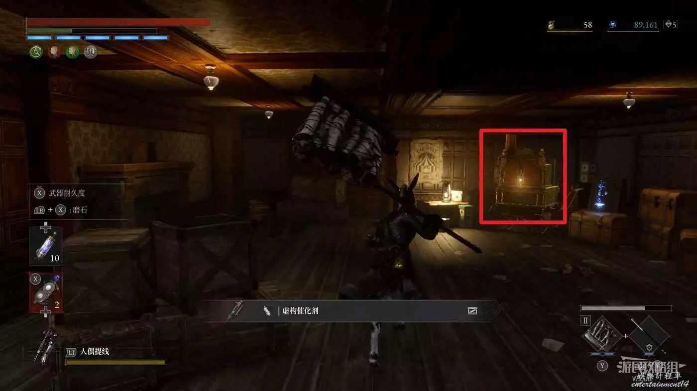 轉頭面朝金色雕像後方,右側的箱子處可以撿到一個【虛構催化劑】。
