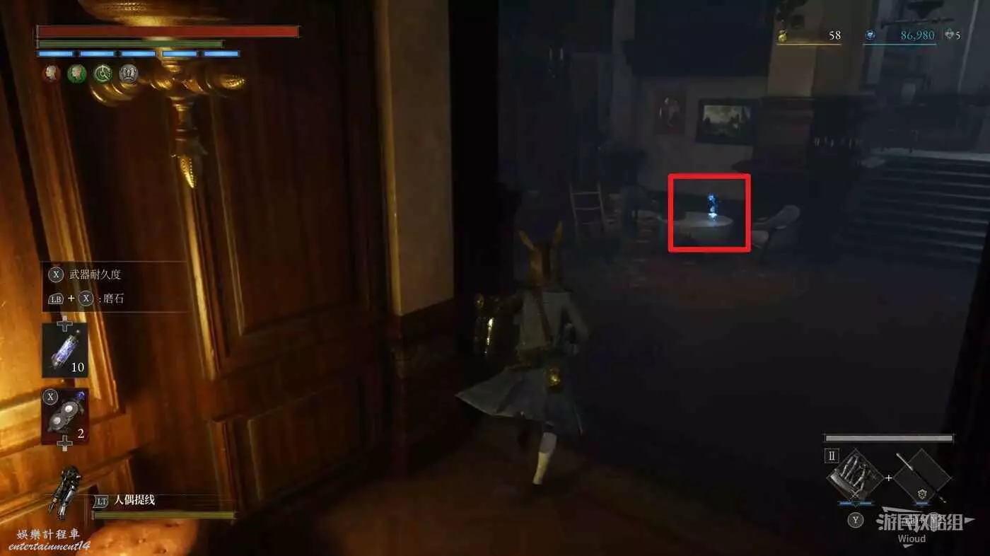 進入篝火左側房間可撿到道具1,回到走廊直走左拐,盡頭處可找到一個寶箱,裡面撿到【狂暴護身符】。