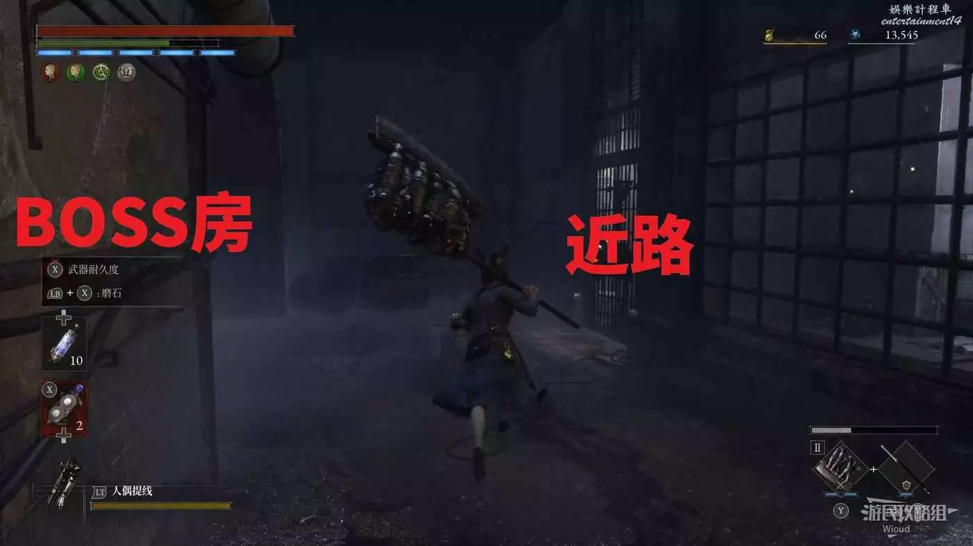 不遠處遇到一個坐在照片牆位置的精英怪,將其擊敗後穿過它右邊的房間,沿著樓梯到底部,解鎖左邊的大門開啟近路。