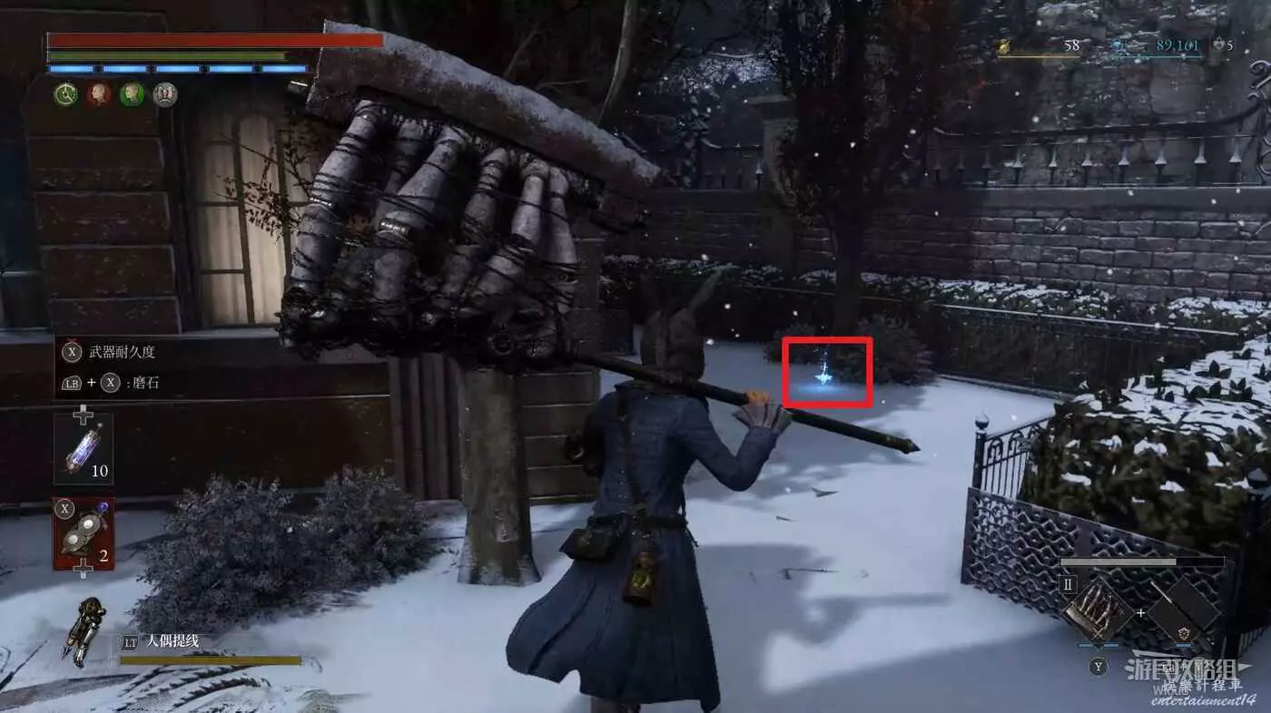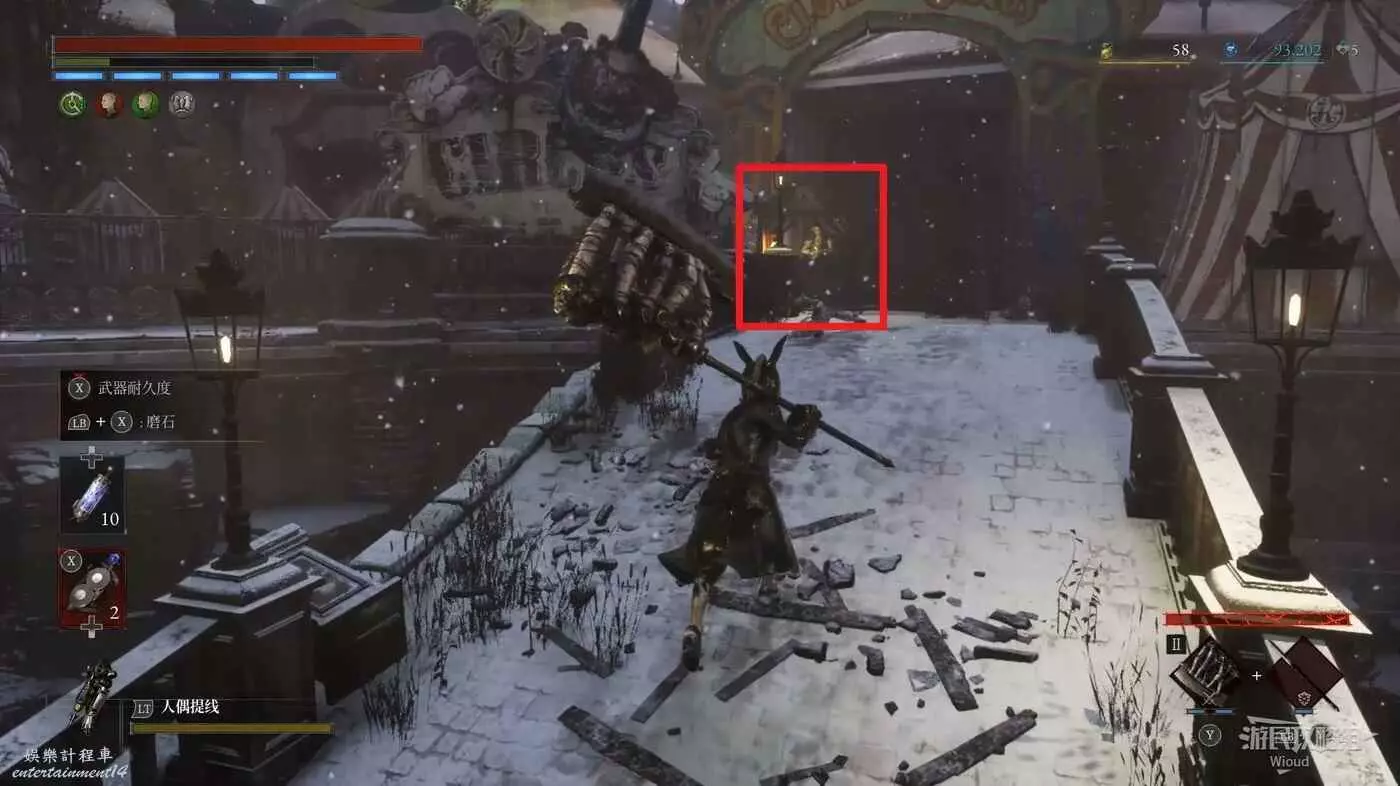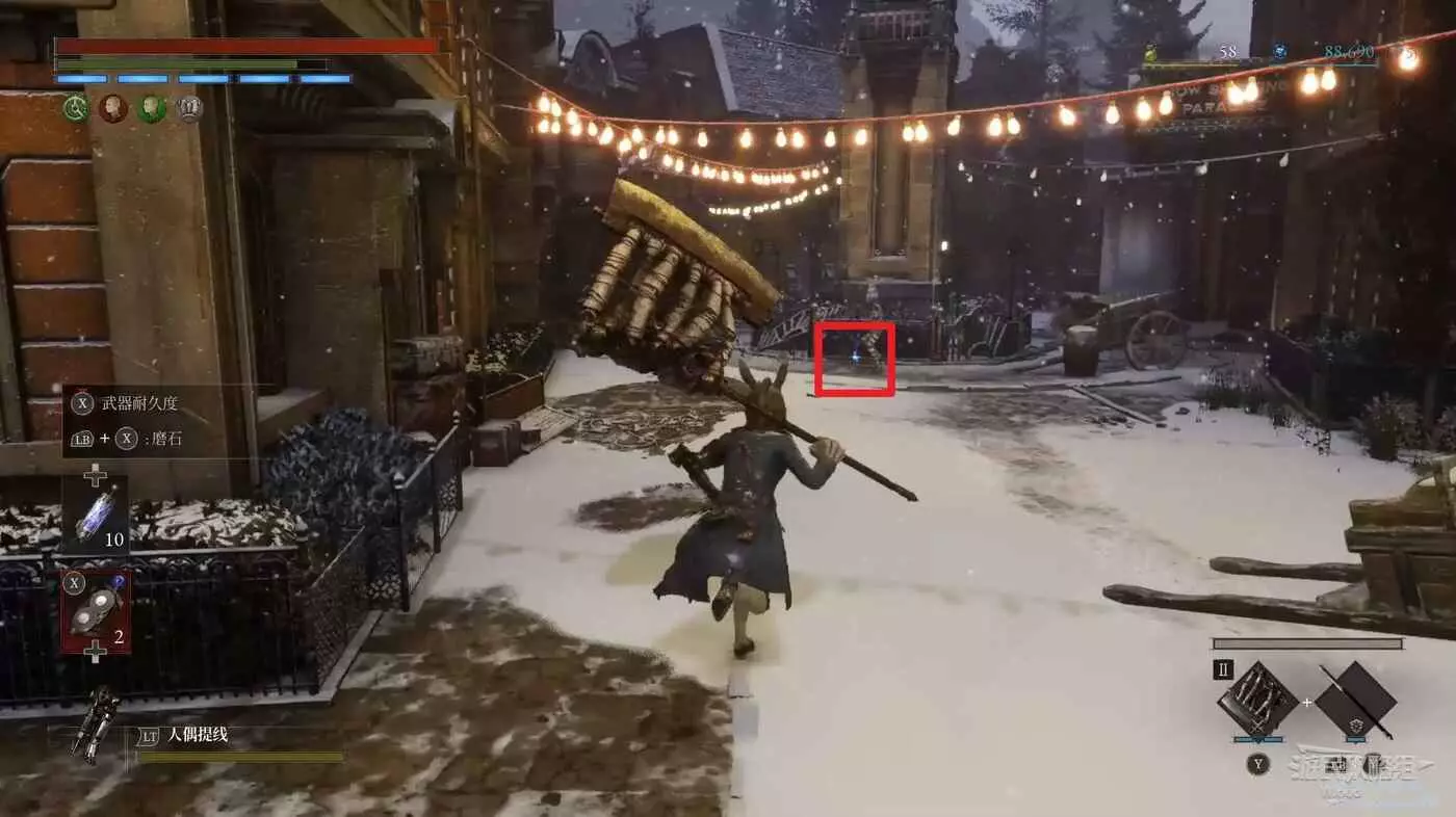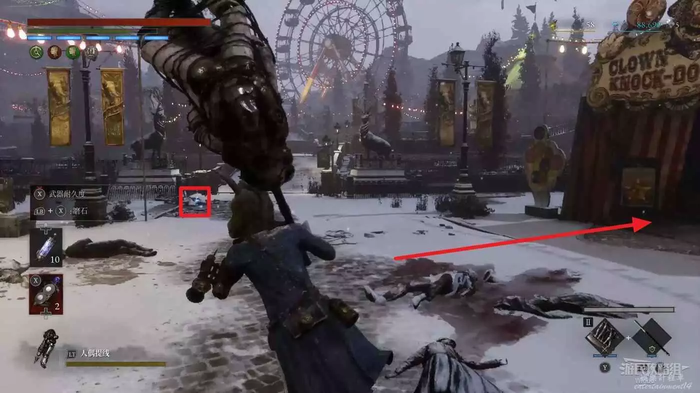 回到剛進這個區域的大入口往左走,不遠處紅框所示位置可以撿到第二個【狂歡幣】。