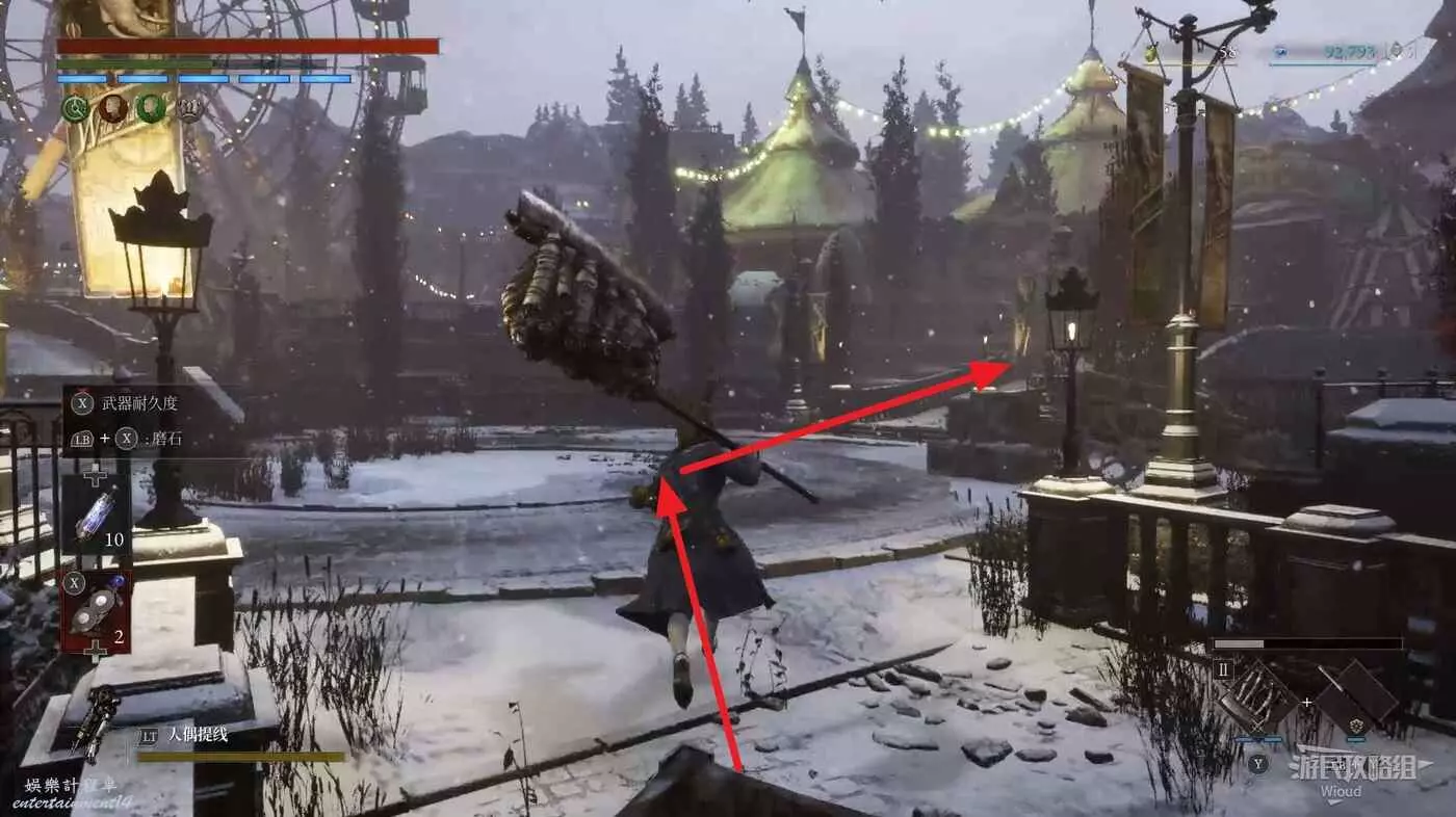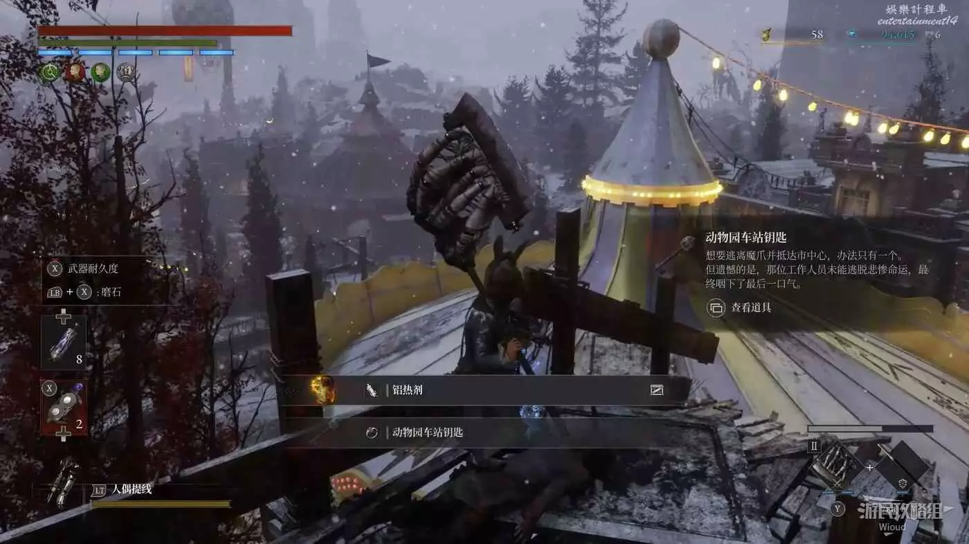 此處可以撿到【動物園車站鑰匙】,然後跳到旋轉木馬頂棚上,這裡有一個缺口跳到旋轉木馬裡面。