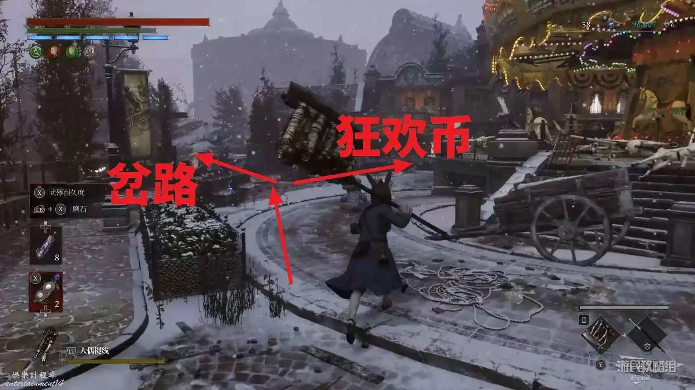 離開帳篷,貼著旋轉木馬往左走,長凳上有個道具點,而這個長凳旁有個往左側走的岔路,先無視貼著旋轉木馬走到深處,可撿到第四個【狂歡幣】。