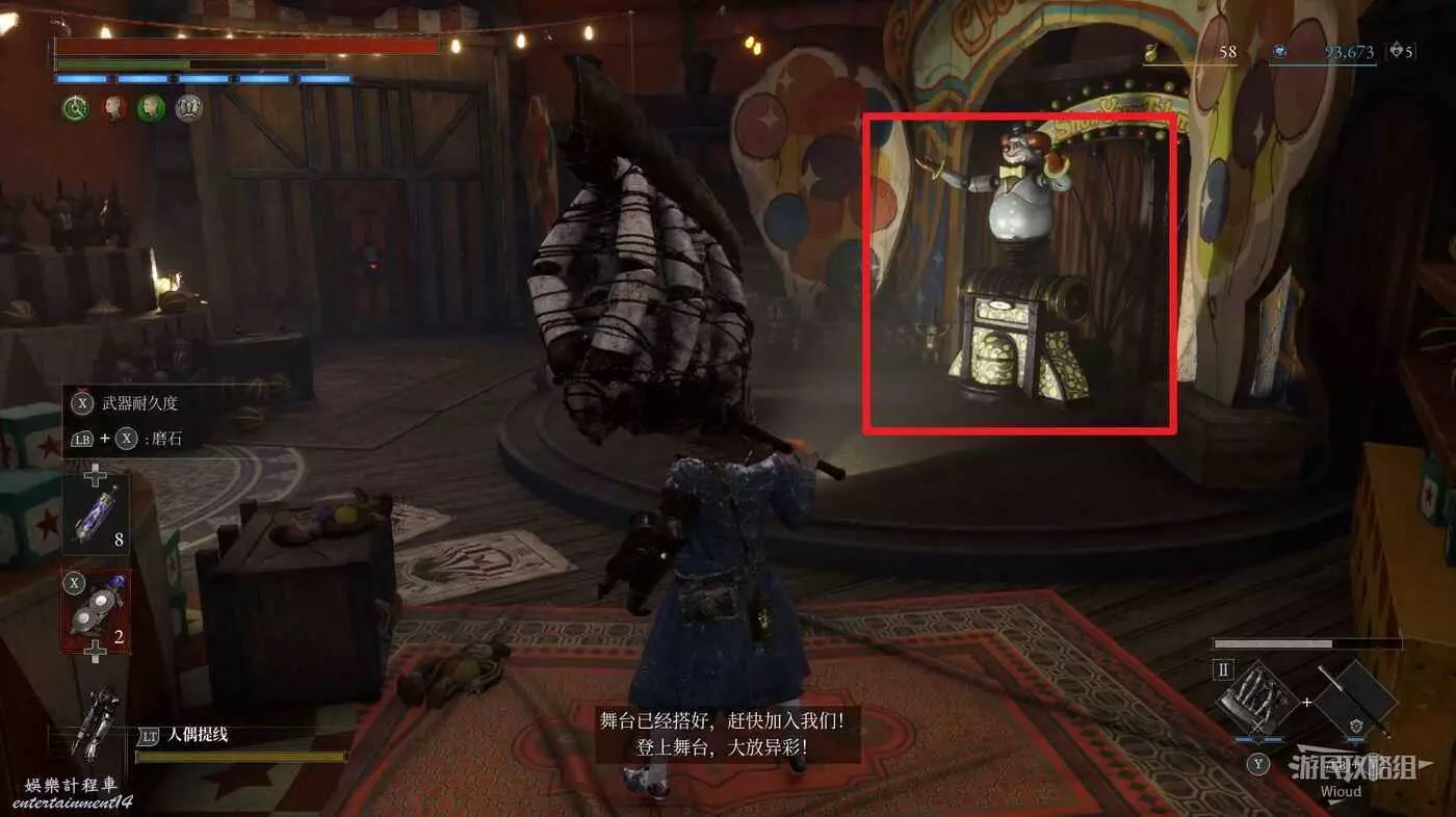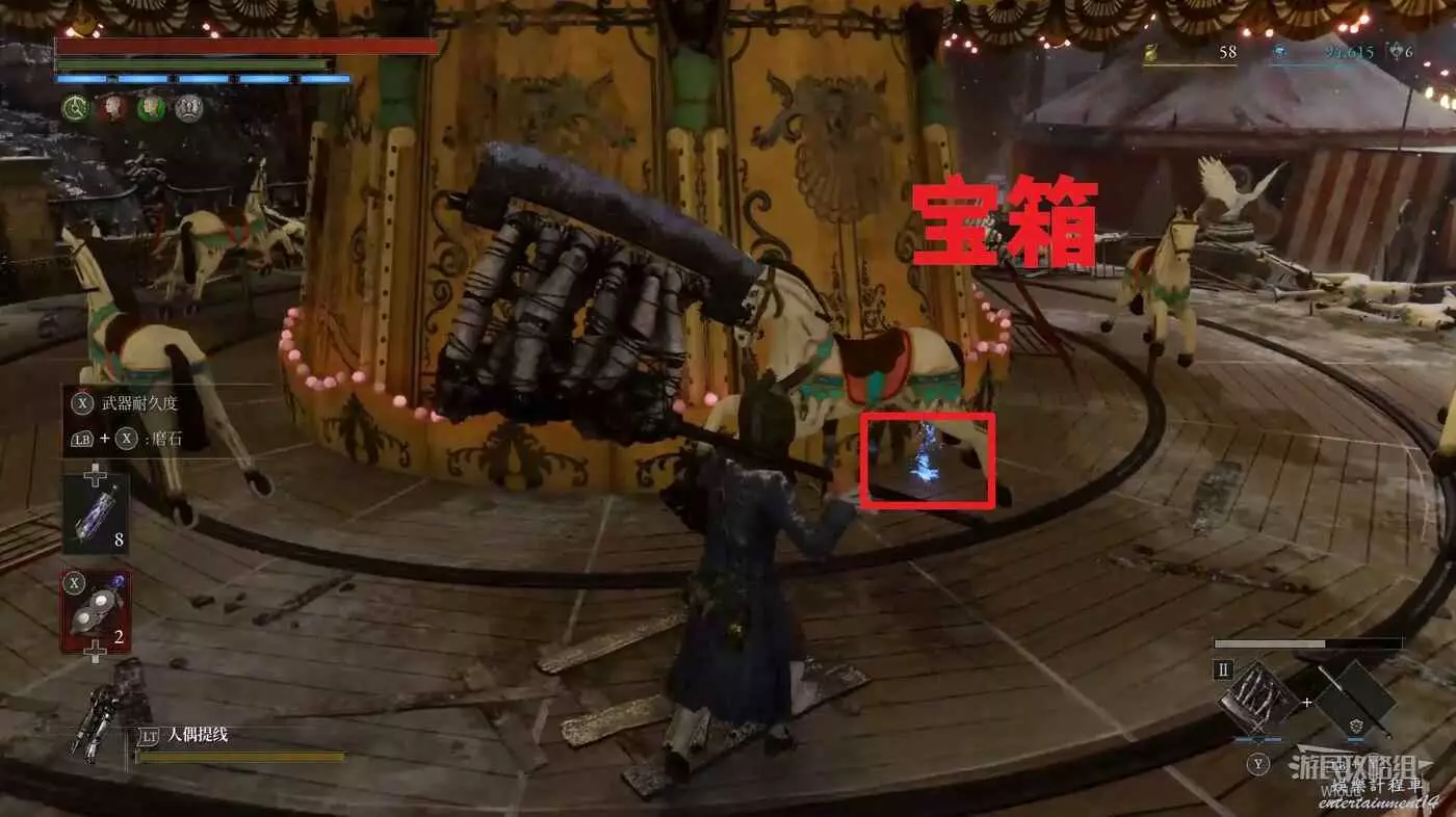 回到中間往左看,左側角落紅框處有個容易被忽略的道具點,往前方旋轉木馬位置走,注意進入旋轉木馬區域前右拐,有個小遊戲帳篷。
