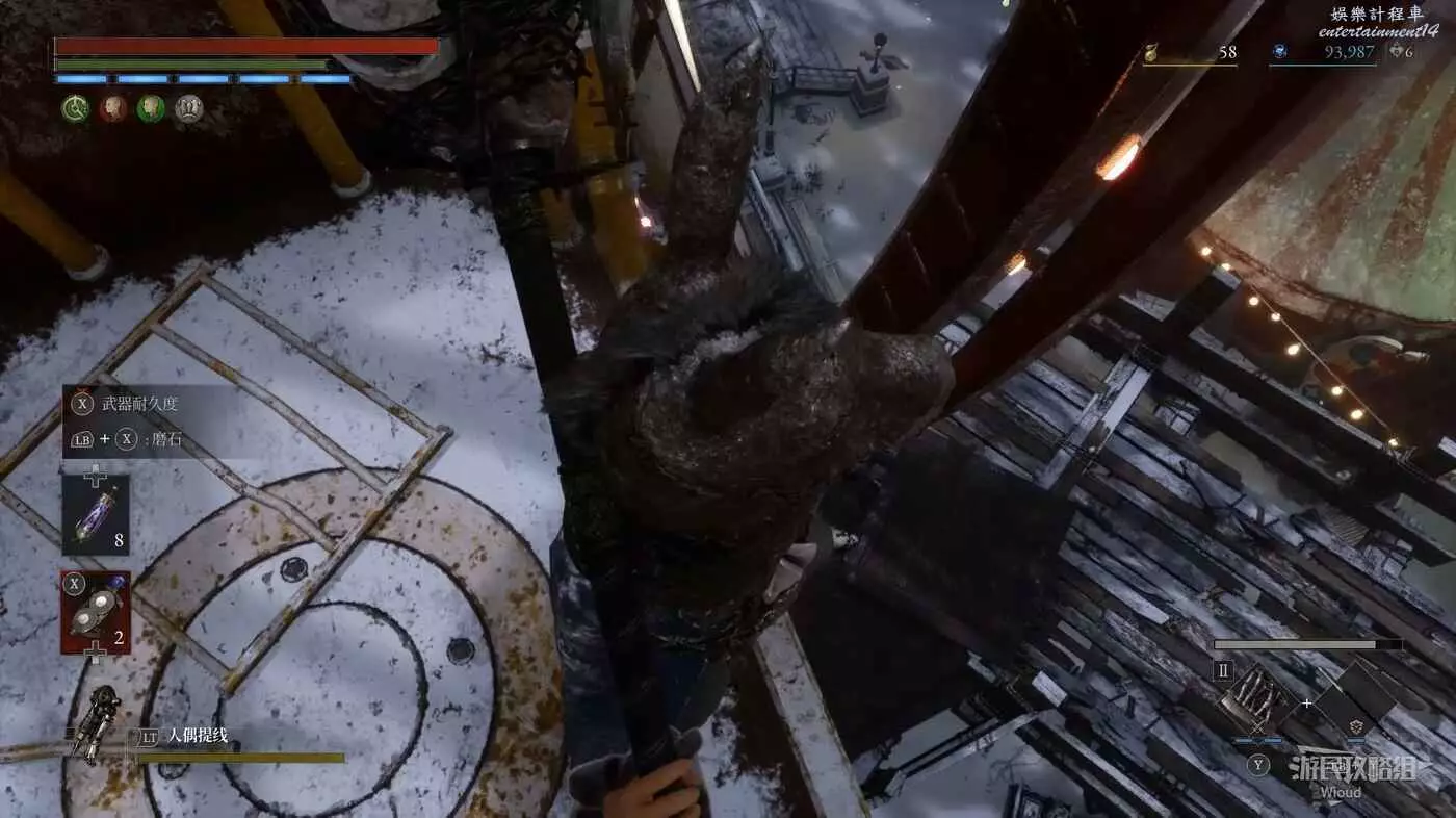 等到看到一個木板橋直接跳上去,沿路走到旋轉木馬的頂棚。