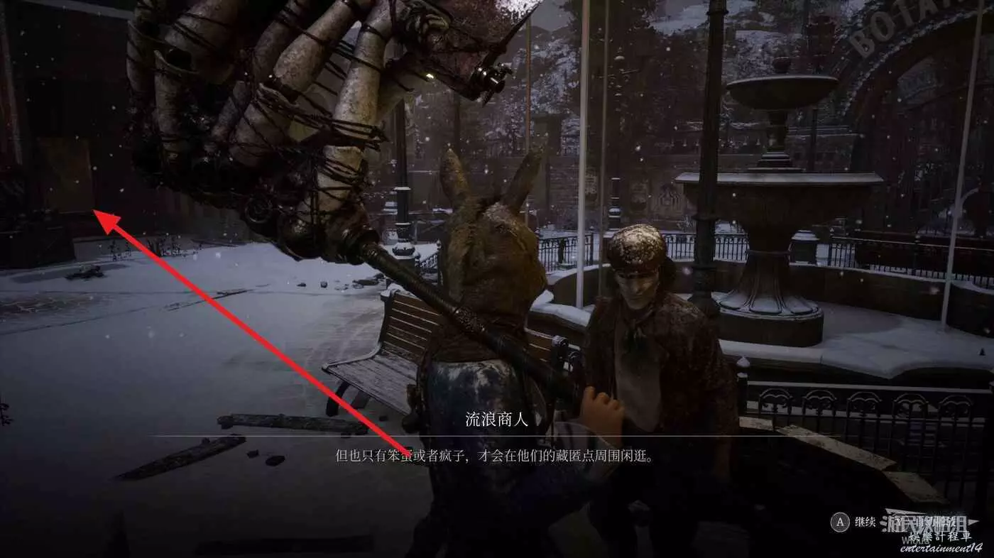 穿過石橋往右看,拾取右側長凳上的道具點,與右側盡頭的NPC互動投入一個狂歡幣進入後方建築。
