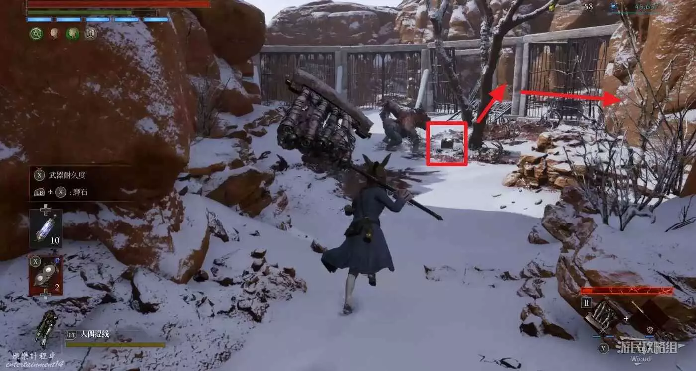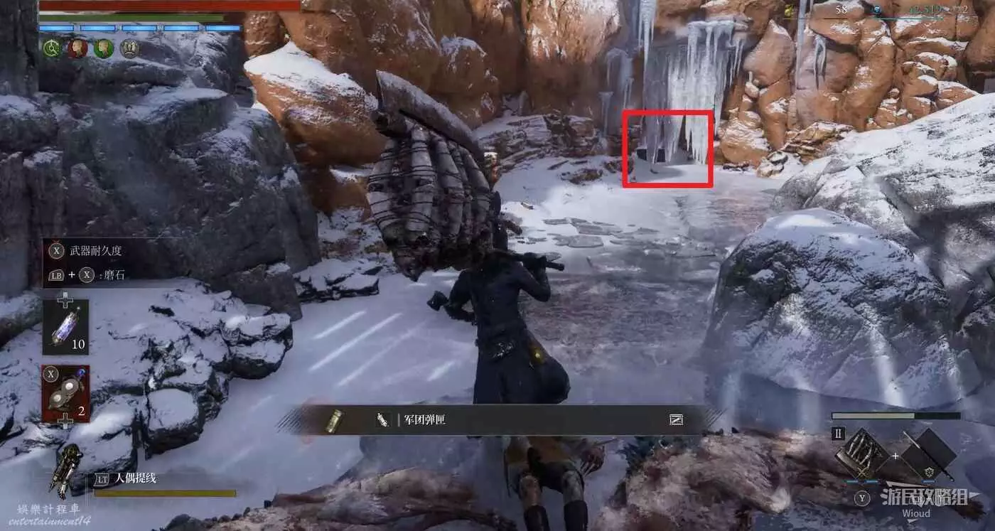 有個被冰柱擋住的寶箱,裡面可撿到【軍團口徑】。