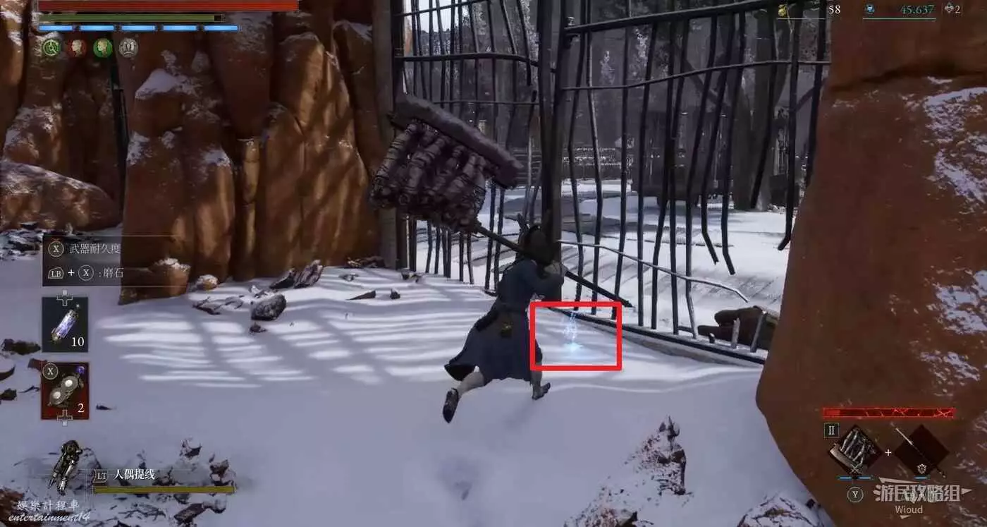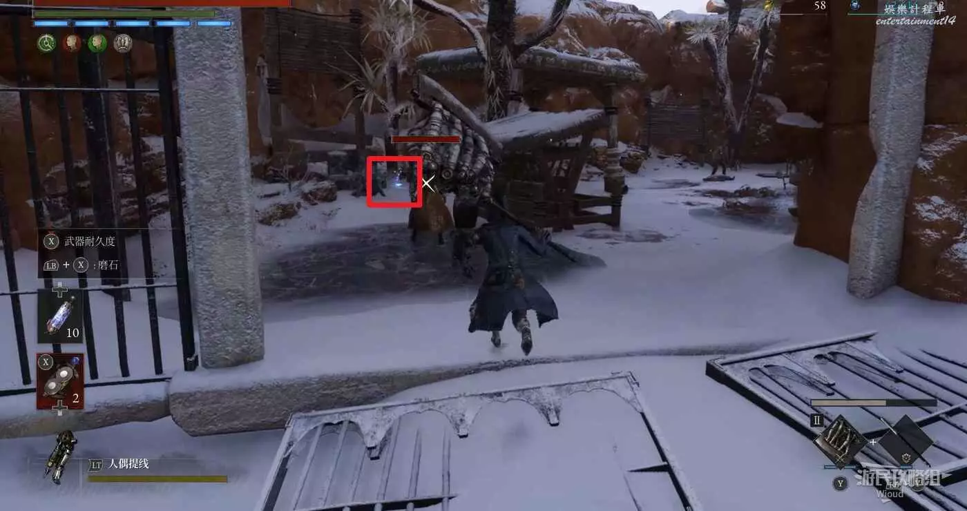 開啟通往冒險大廳篝火的近路後轉頭看向後方全是籠子的開闊區域,左側全是冰塊的牆壁處可以撿到一個【屬性抗性安瓶】,注意冰牆壁右側有個入口,記住這個入口但先不進去。