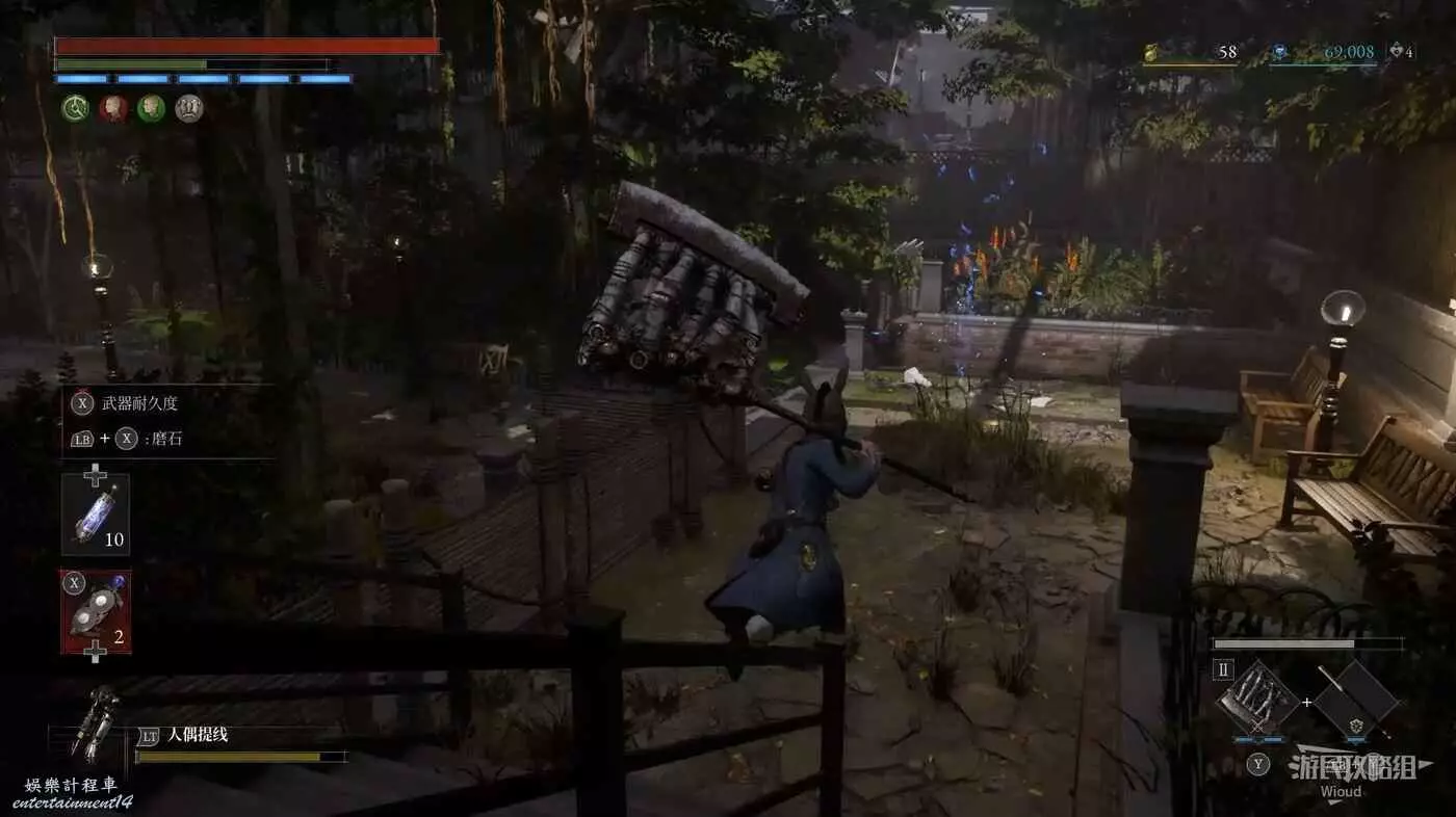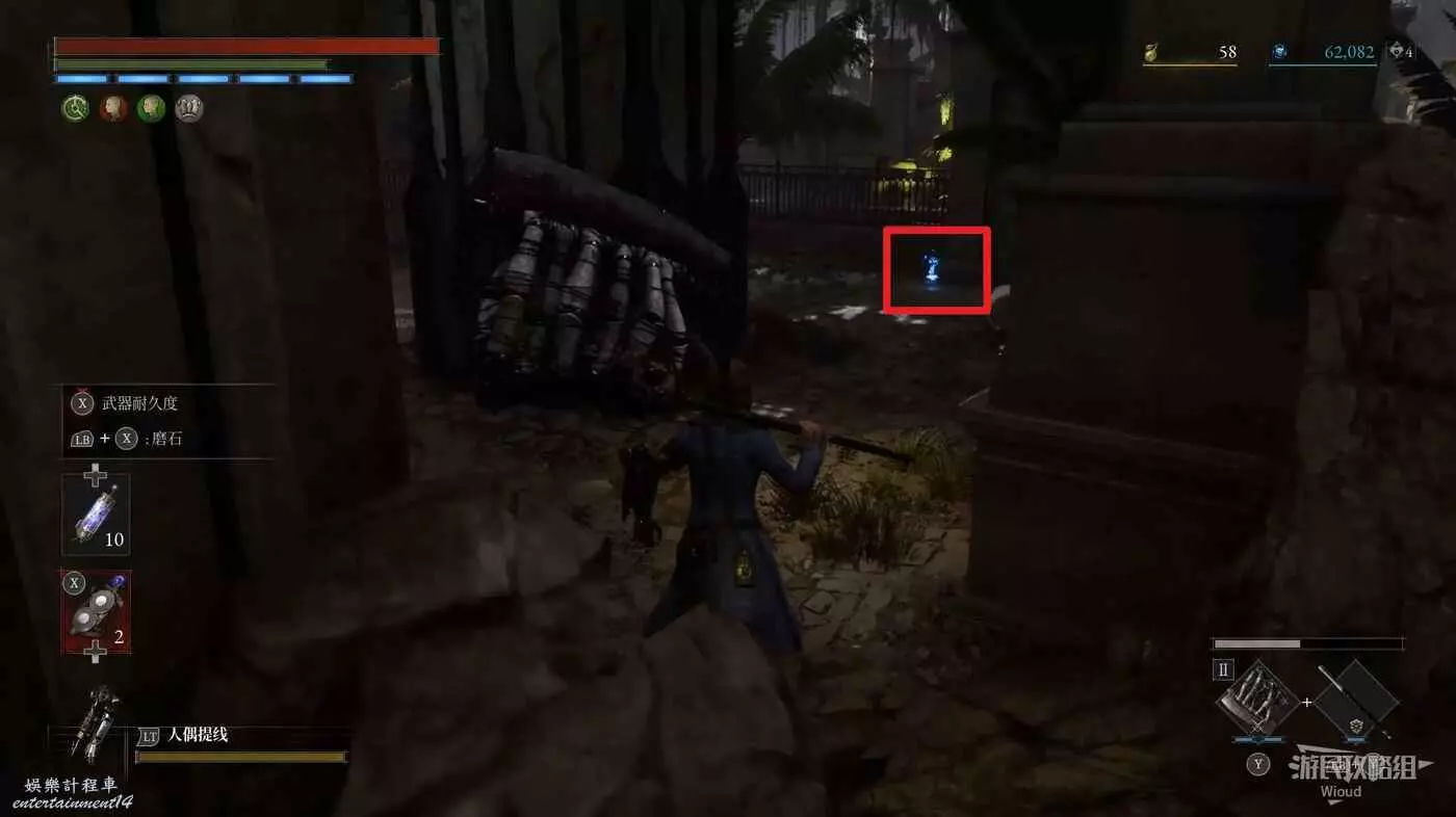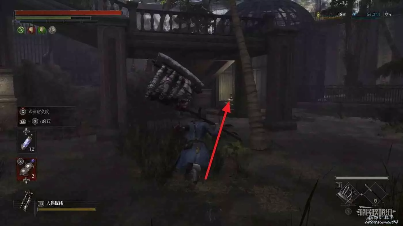 篝火右前方被障礙物擋住的大門前屍體處可撿到一個【屬性淨化安瓶】,打開左側建築大門進入花園內部。