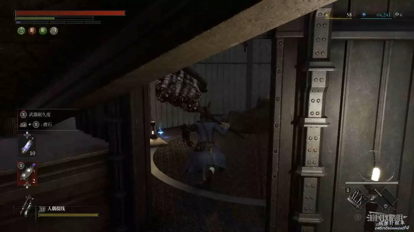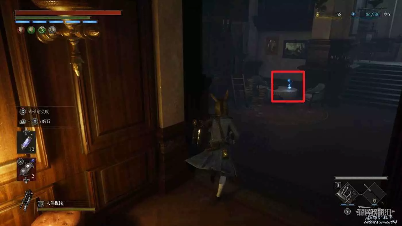 回到煉金師屍體處,走左邊往上的主路,盡頭開啟之前入口左側那個緊閉的大門,然後進入左側的房間內。