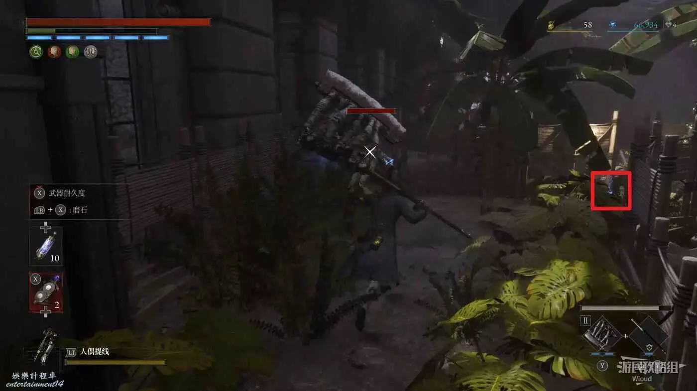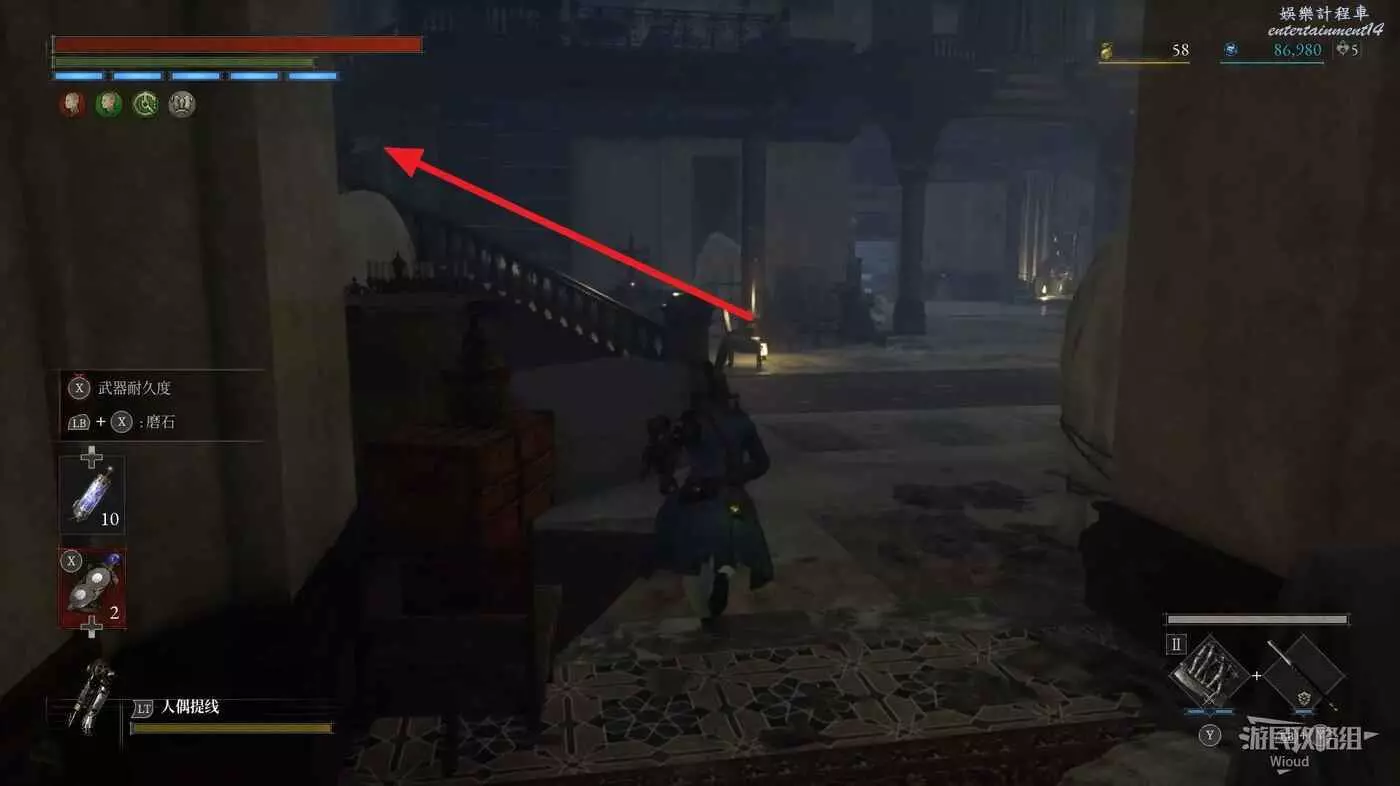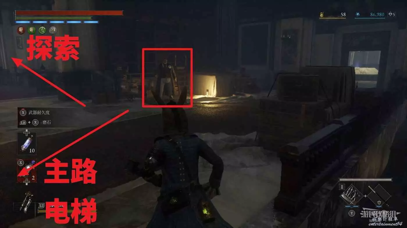 然後繼續主線的電梯就在這個NPC斜對面,但我們先跟著下圖探索箭頭往旁邊走廊移動,繞回篝火大廳。