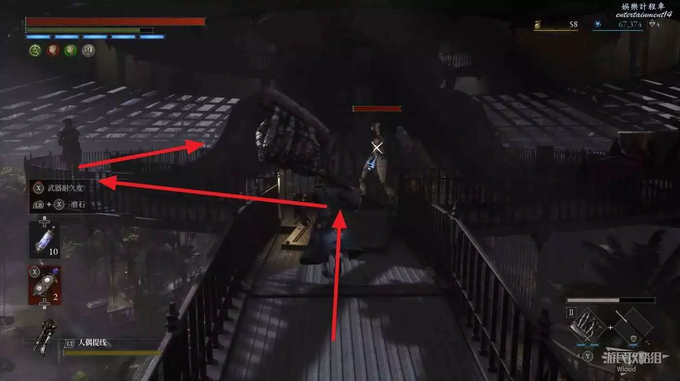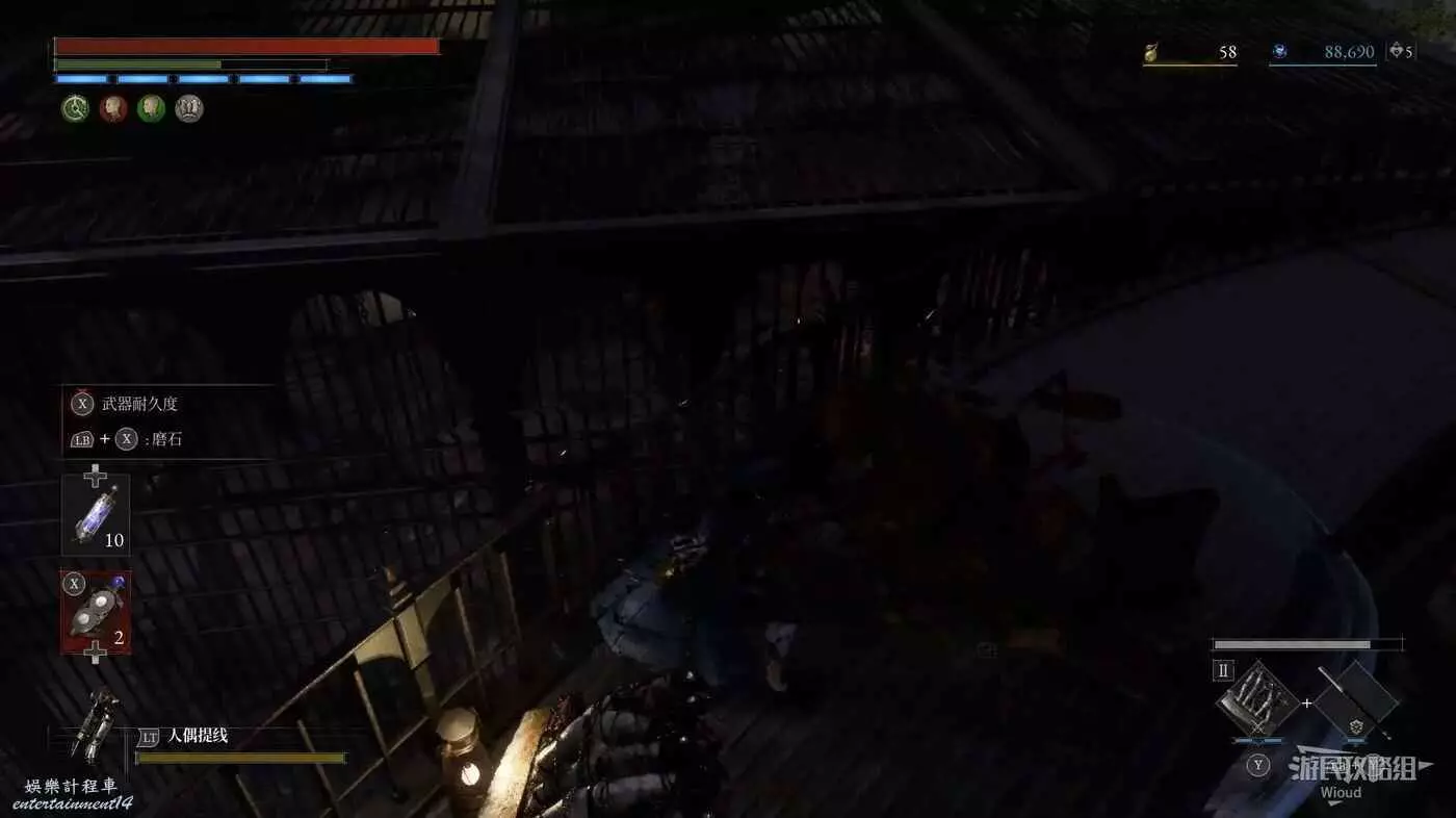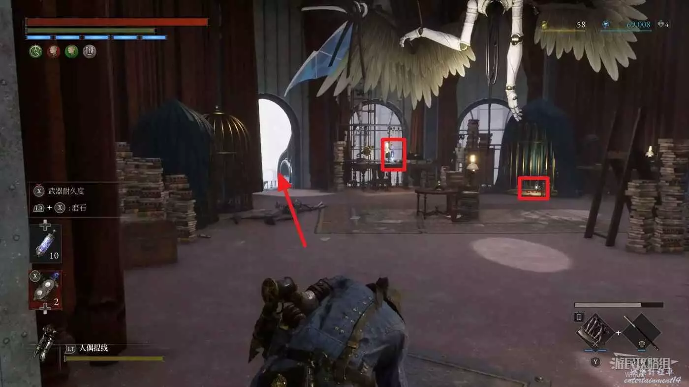然後繼續主線的電梯就在這個NPC斜對面,但我們先跟著下圖探索箭頭往旁邊走廊移動,繞回篝火大廳。