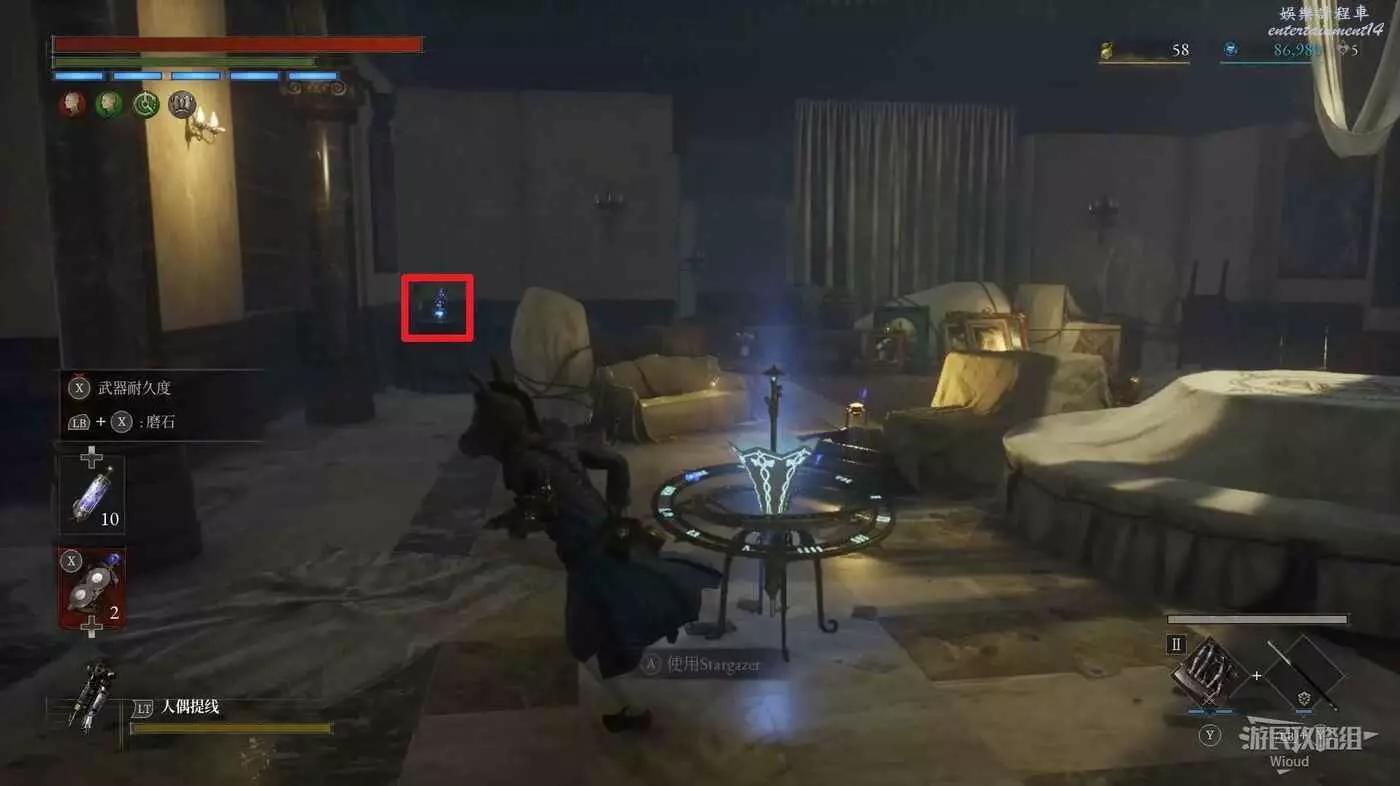 從桌子旁樓梯上來,與燈光處的NPC對話,可以用【古老圓盤】與這個NPC換東西。