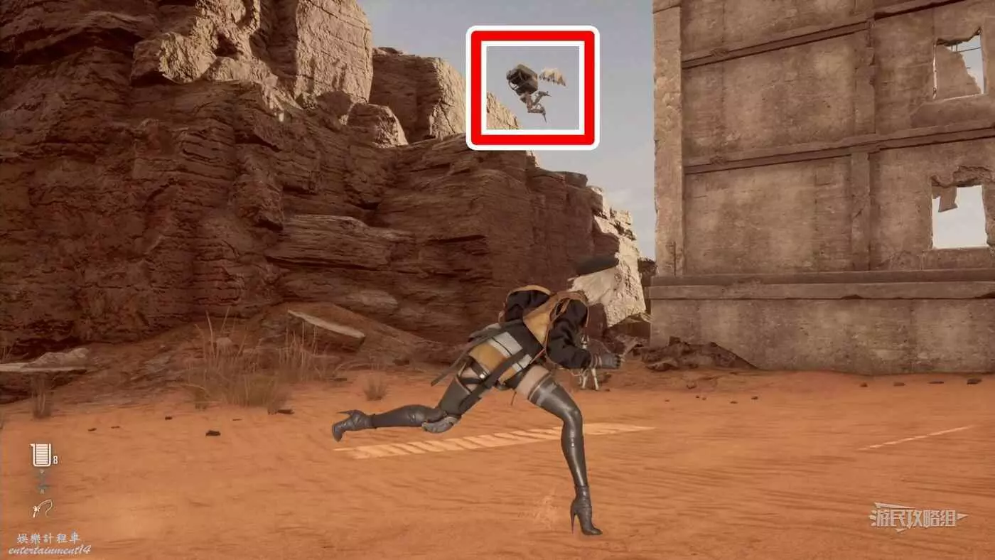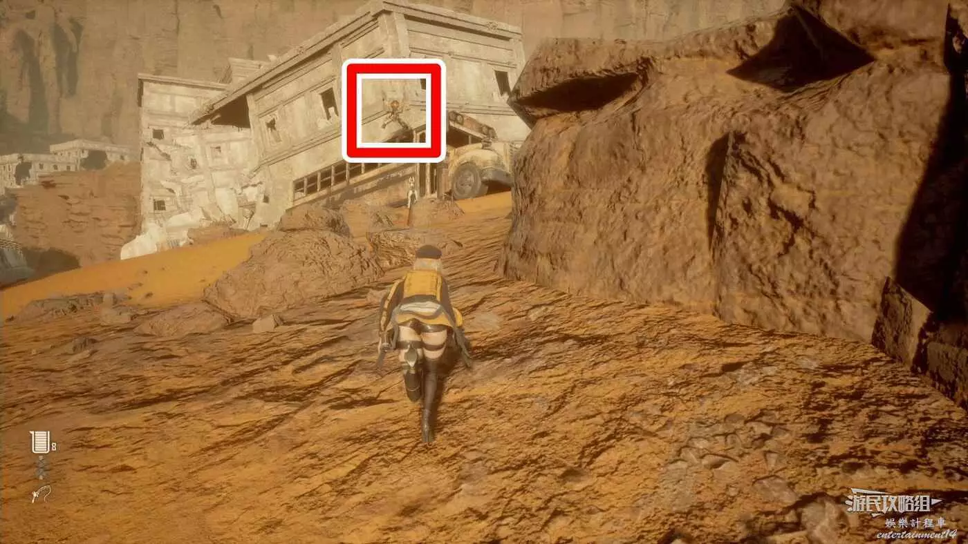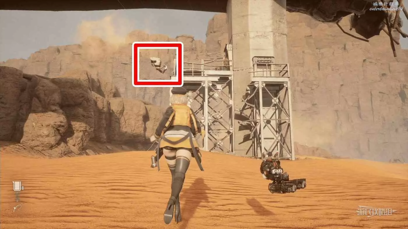 前往大沙漠東北邊廢墟,在附近調查無人機,無人機在懸崖上,可以利用小台階跳上懸崖頂部。