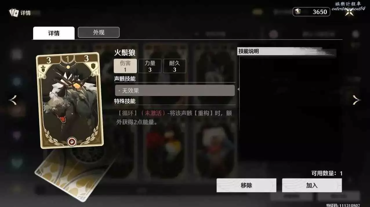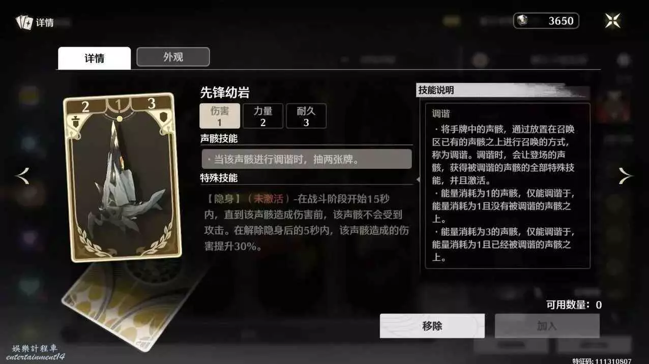 能力:(變幻)從卡組中展示至多三個能量消耗為1的聲骸,選擇其中一個加入手牌,將未選擇的聲骸洗回卡組