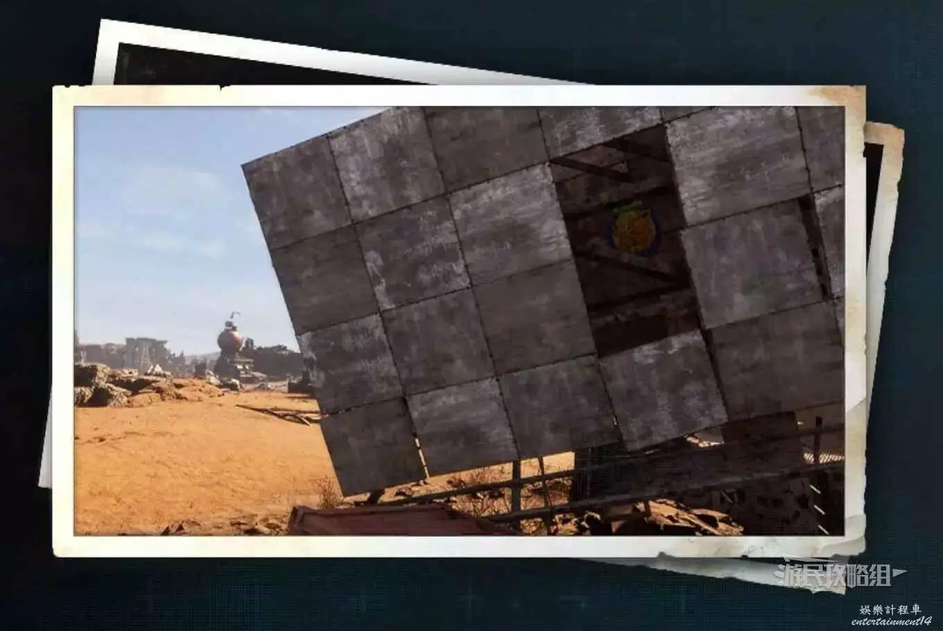 在廢土廢品平原中部北邊一塊巨大廣告牌的背面,廣告牌的正面印著字母DG。