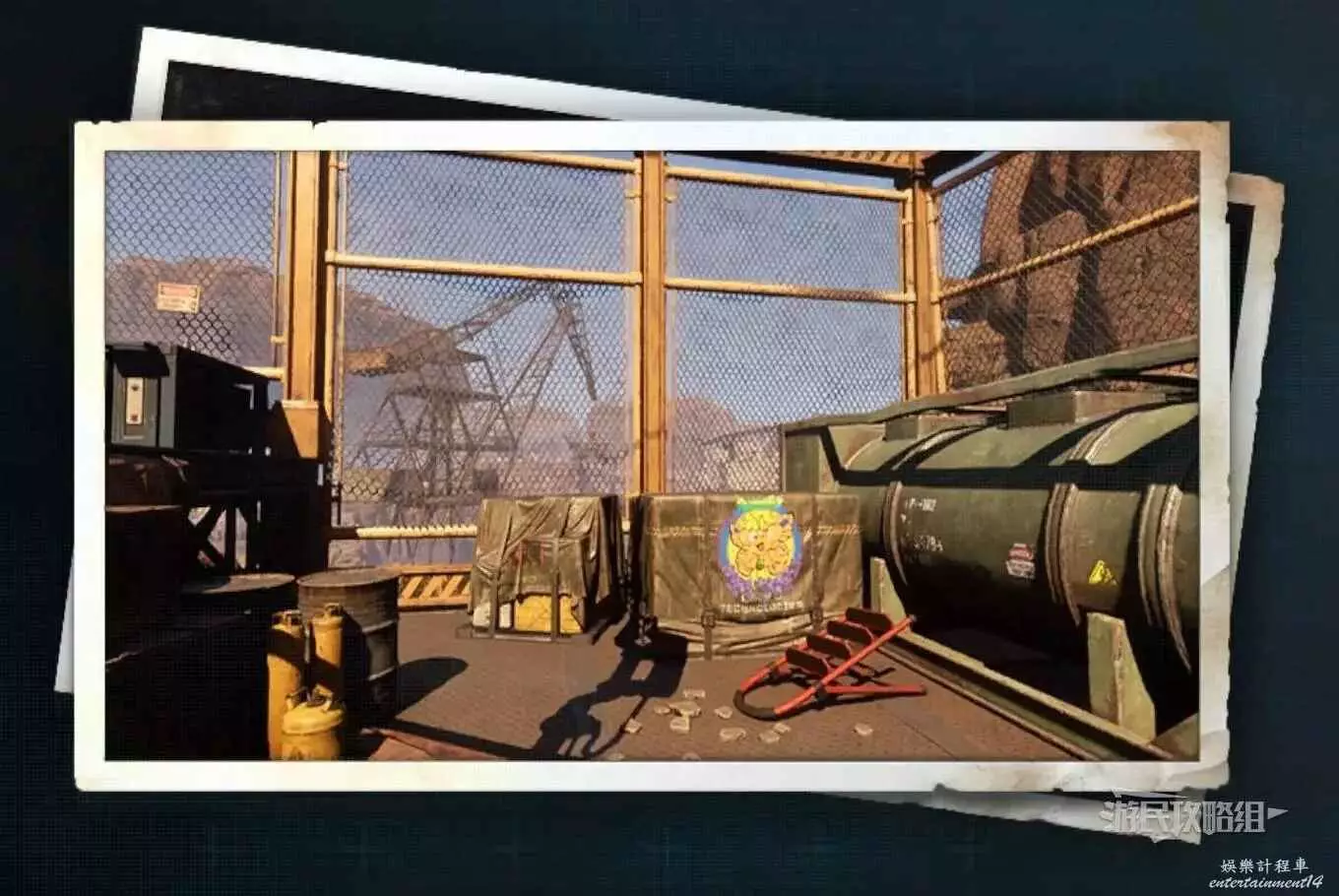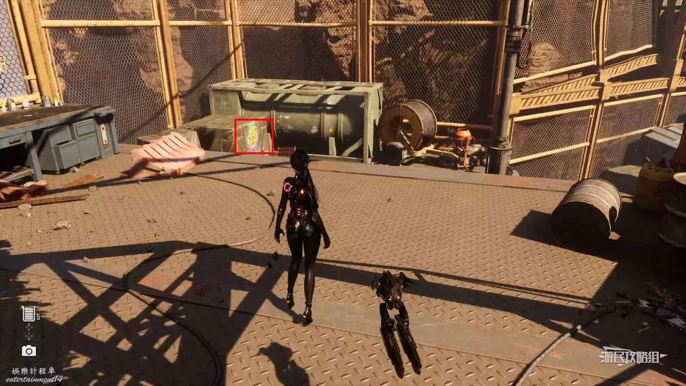 在廢土北邊的金屬平台上,平台上有許多罩著防水布的集裝箱,這個蝴蝶就在其中一塊防水布上。