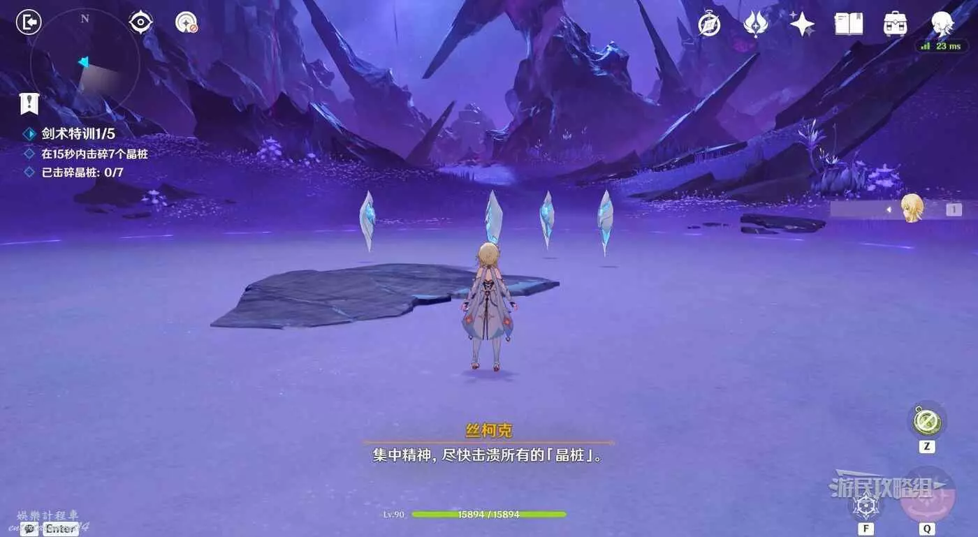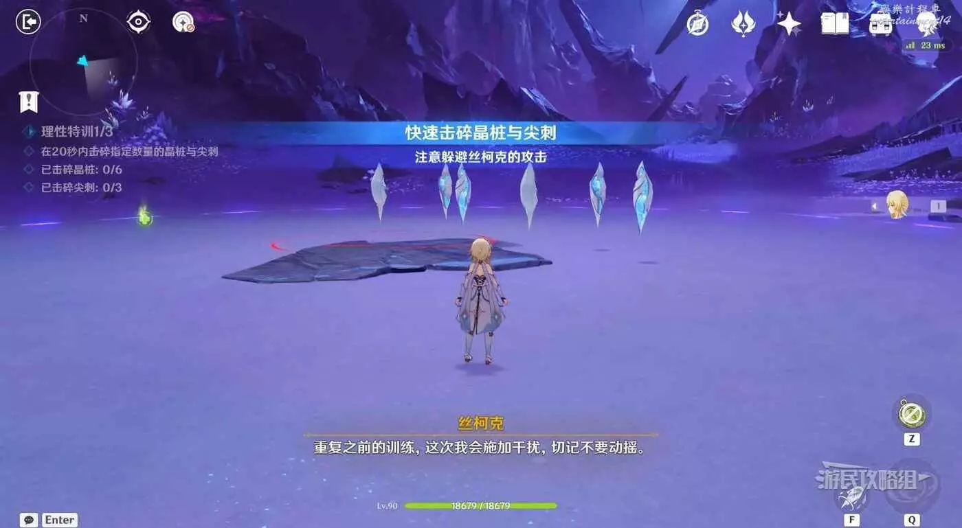 與絲柯克對話後,跟隨任務指引進入深淵開始第一次特訓。與絲柯克對話,然後需要用旅行者的普攻和重擊打碎所有目標,之後重擊的攻擊範圍會提升,合理利用重擊來擊碎目標即可。注意有些訓練是限時的,記得留意介面左側和上方的提醒。