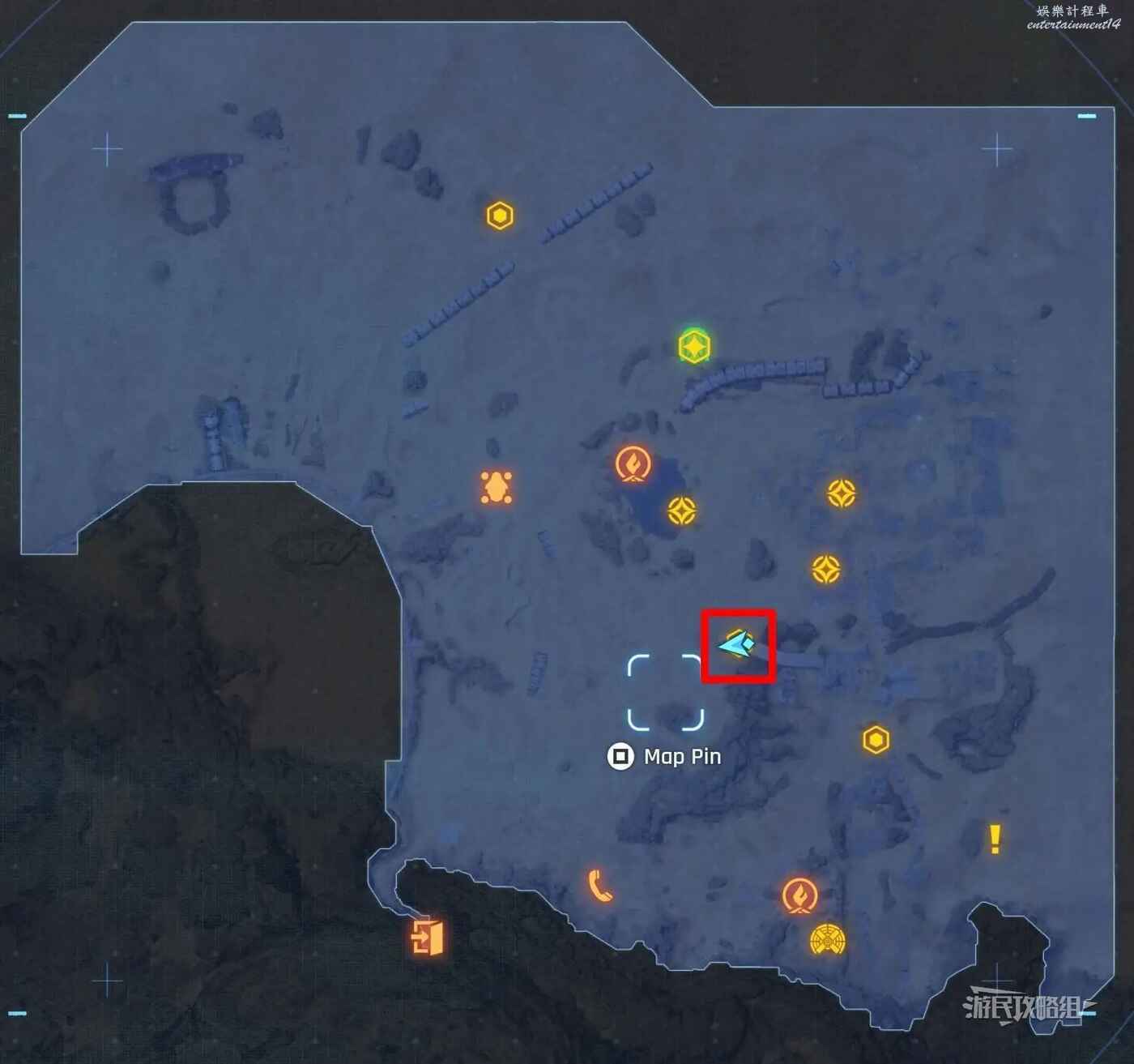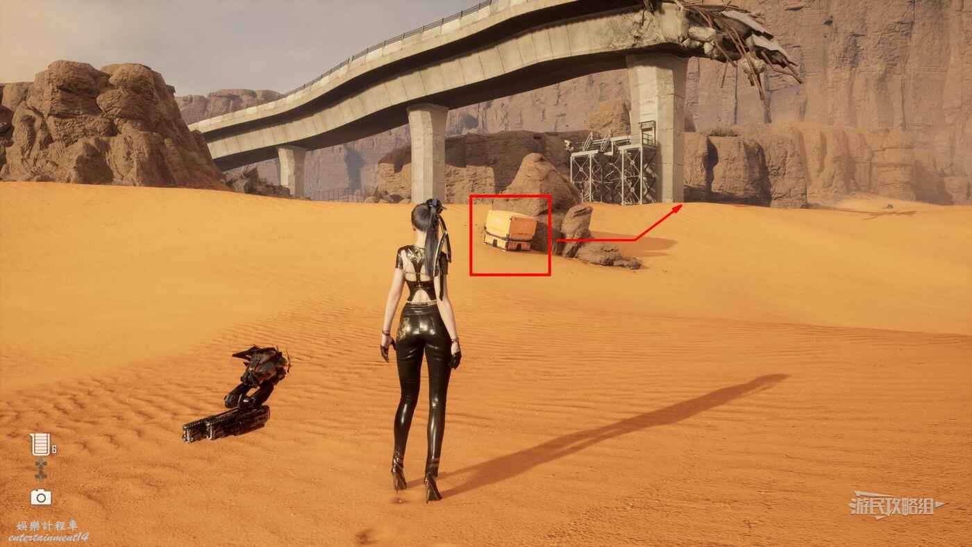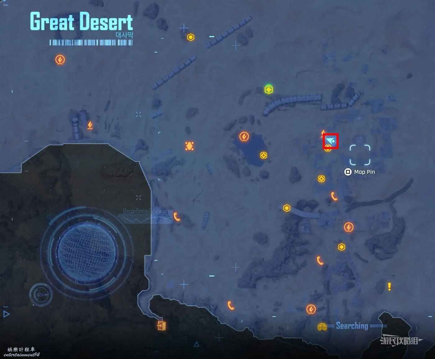 在大沙漠掩埋的廢墟(北)營地往南方向走一點,參考下方地圖所示位置,可以看到一輛巴士、一個梯子還有一個紫色箭頭霓虹燈牌(箭頭向上指),在這些東西對面的建築廢墟中有一根繩索,利用繩索爬到上層平台就能看到這條魚。