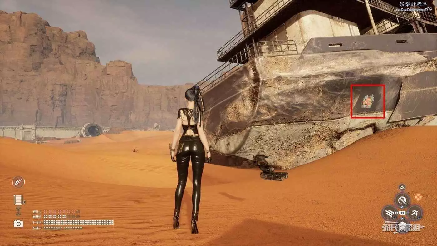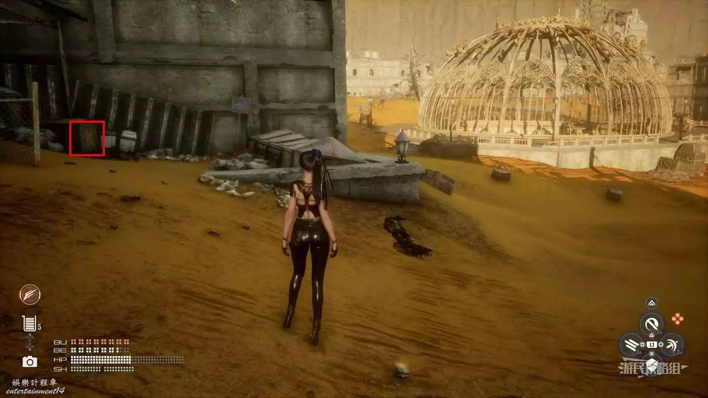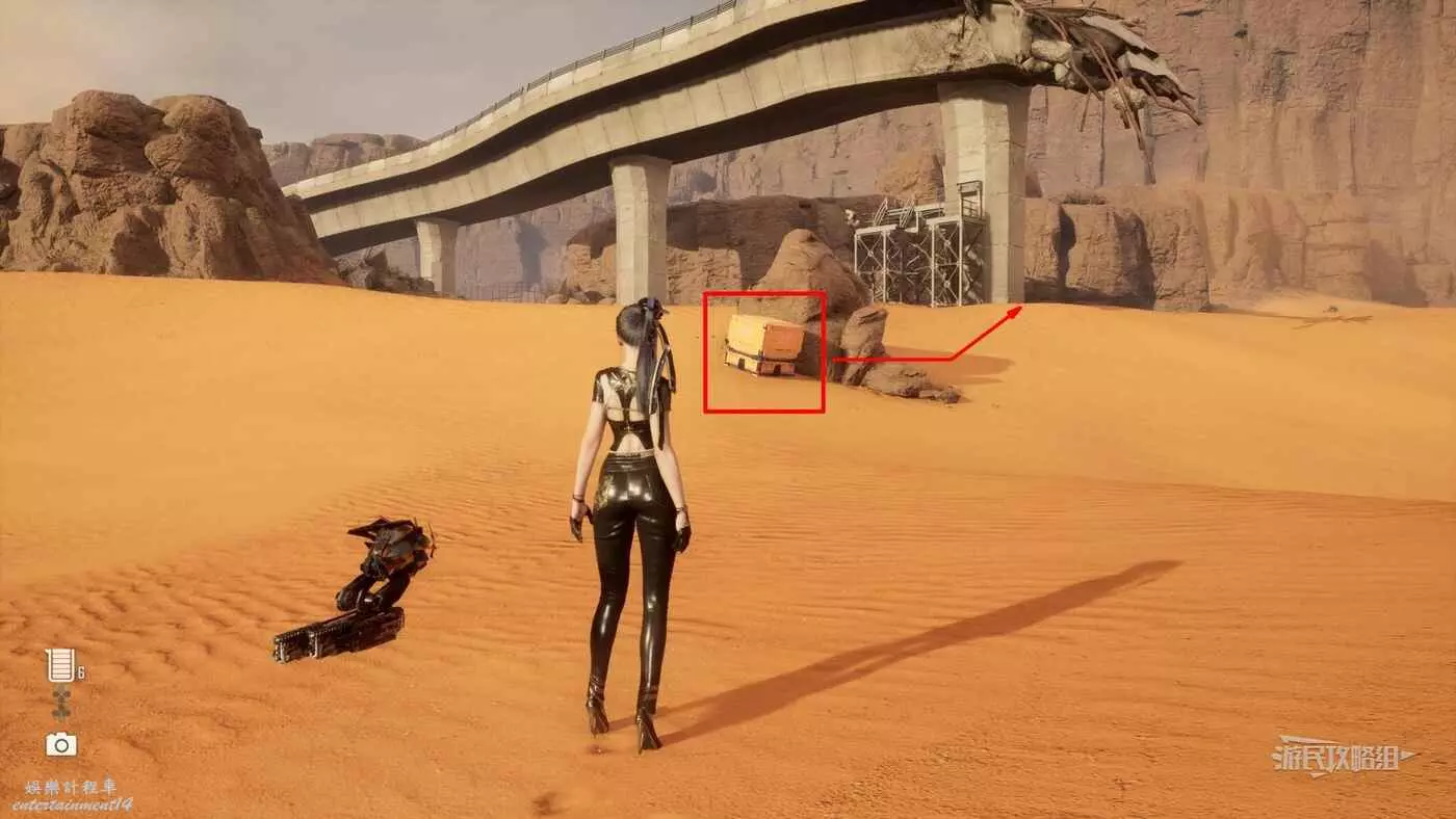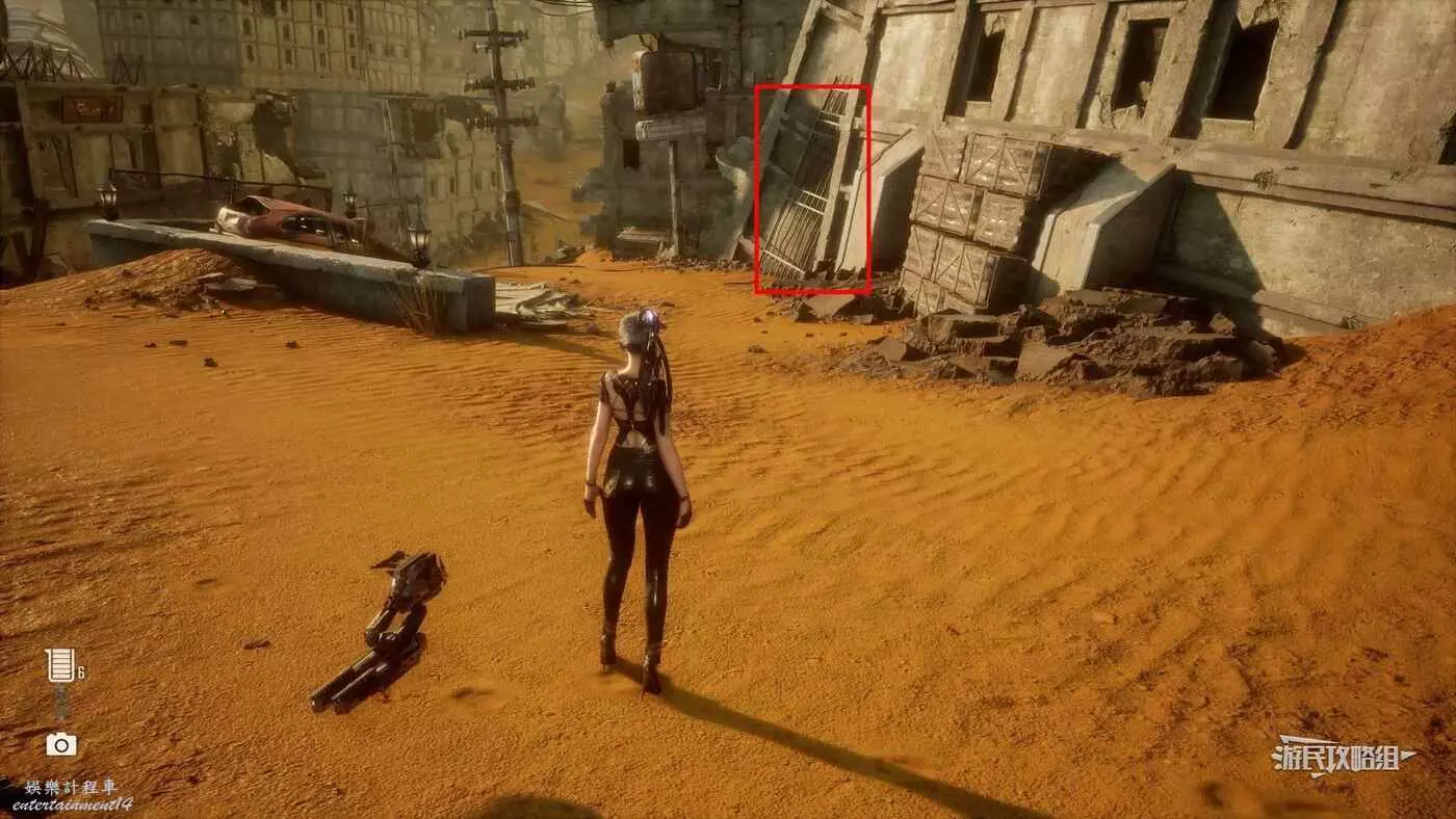 在大沙漠掩埋的廢墟(北)營地,參考上文【純真的魚】的描述,從紫色箭頭霓虹燈牌所在位置往東走,可以看到一段靠在建築廢墟旁邊的金屬柵欄,【神秘的魚】就在這個圍欄的背面,繞過傾斜的建築廢墟就能進入此區域。