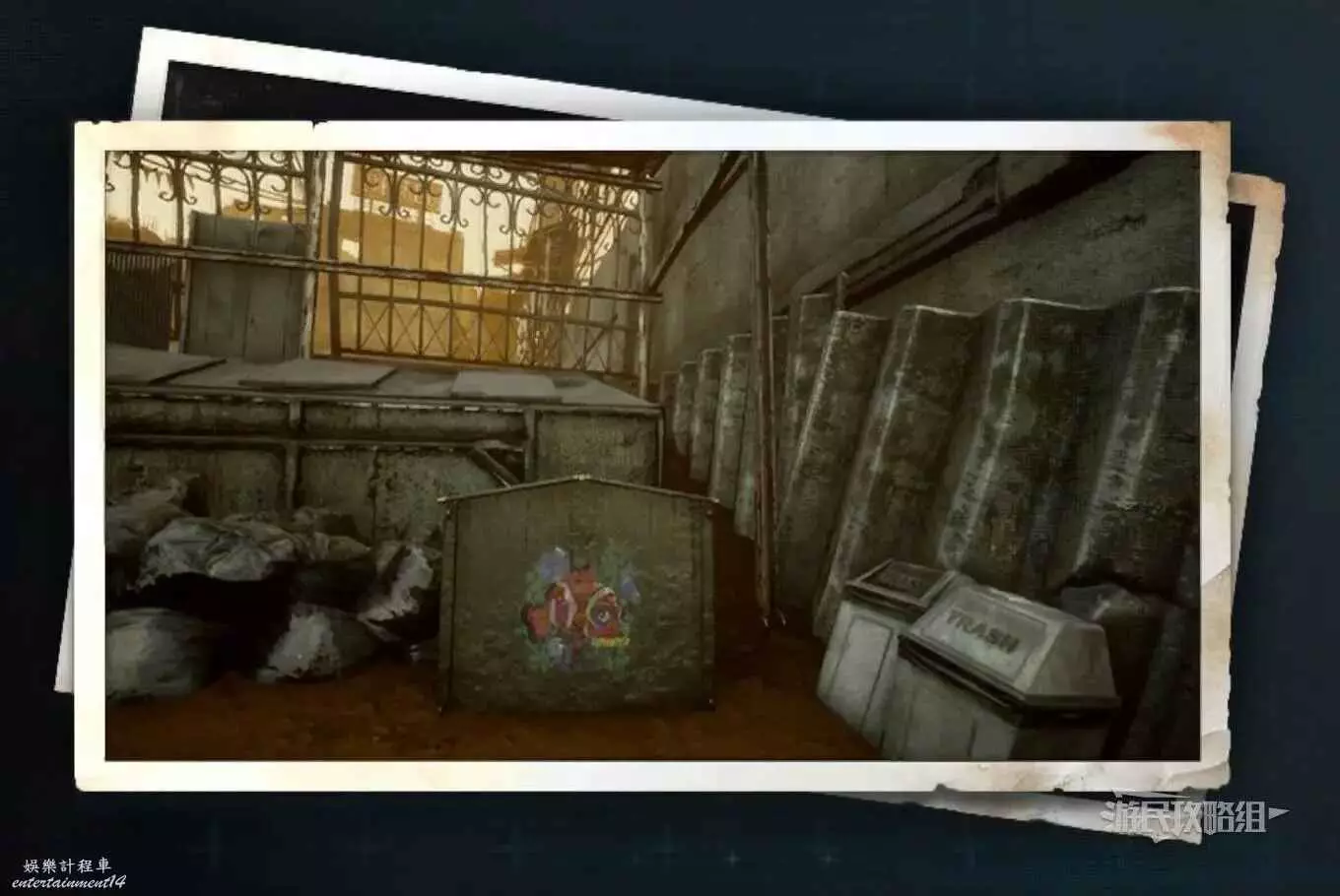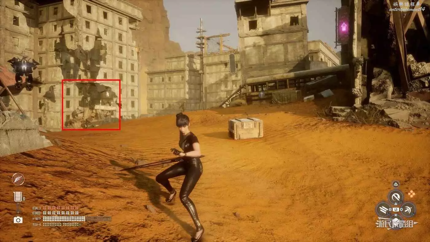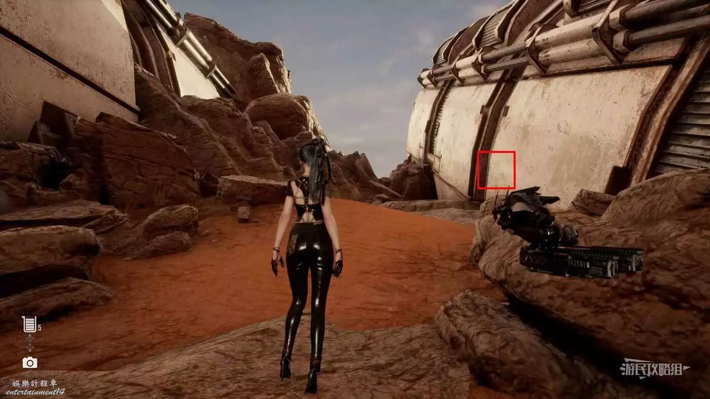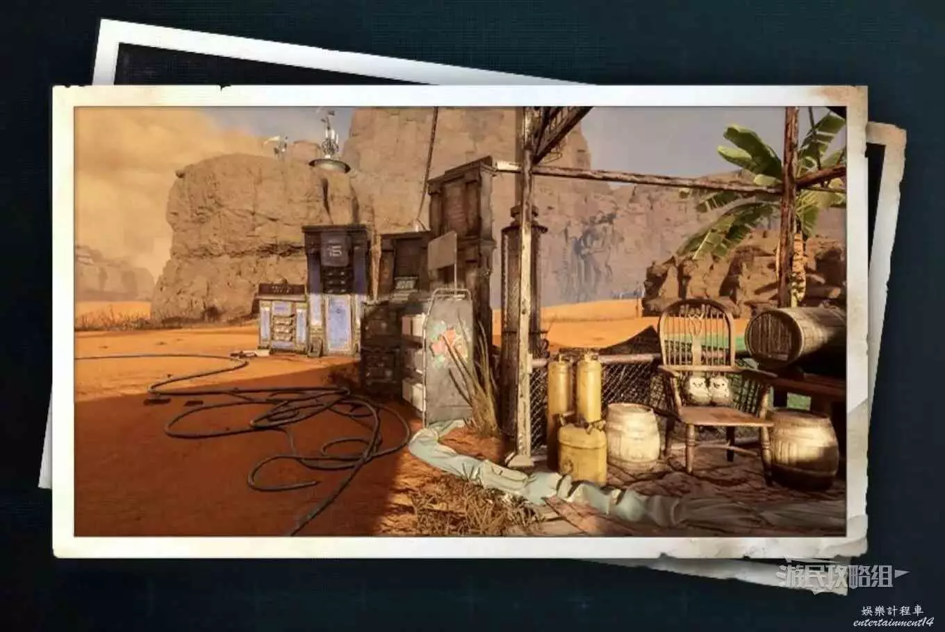 在大沙漠掩埋的廢墟(北)營地,參考上文【純真的魚】的描述,從紫色箭頭霓虹燈牌所在位置往東走,可以看到一段靠在建築廢墟旁邊的金屬柵欄,【神秘的魚】就在這個圍欄的背面,繞過傾斜的建築廢墟就能進入此區域。