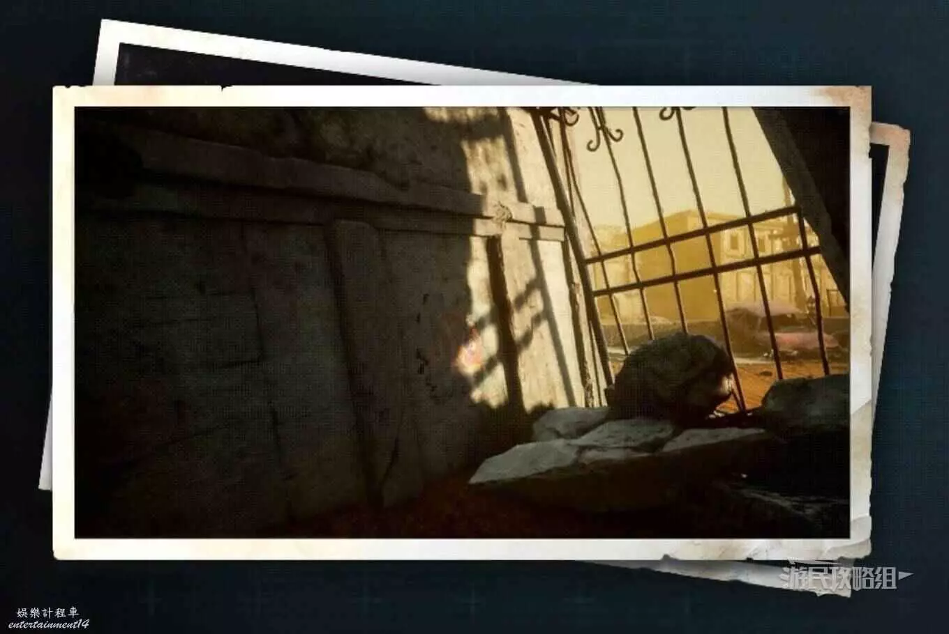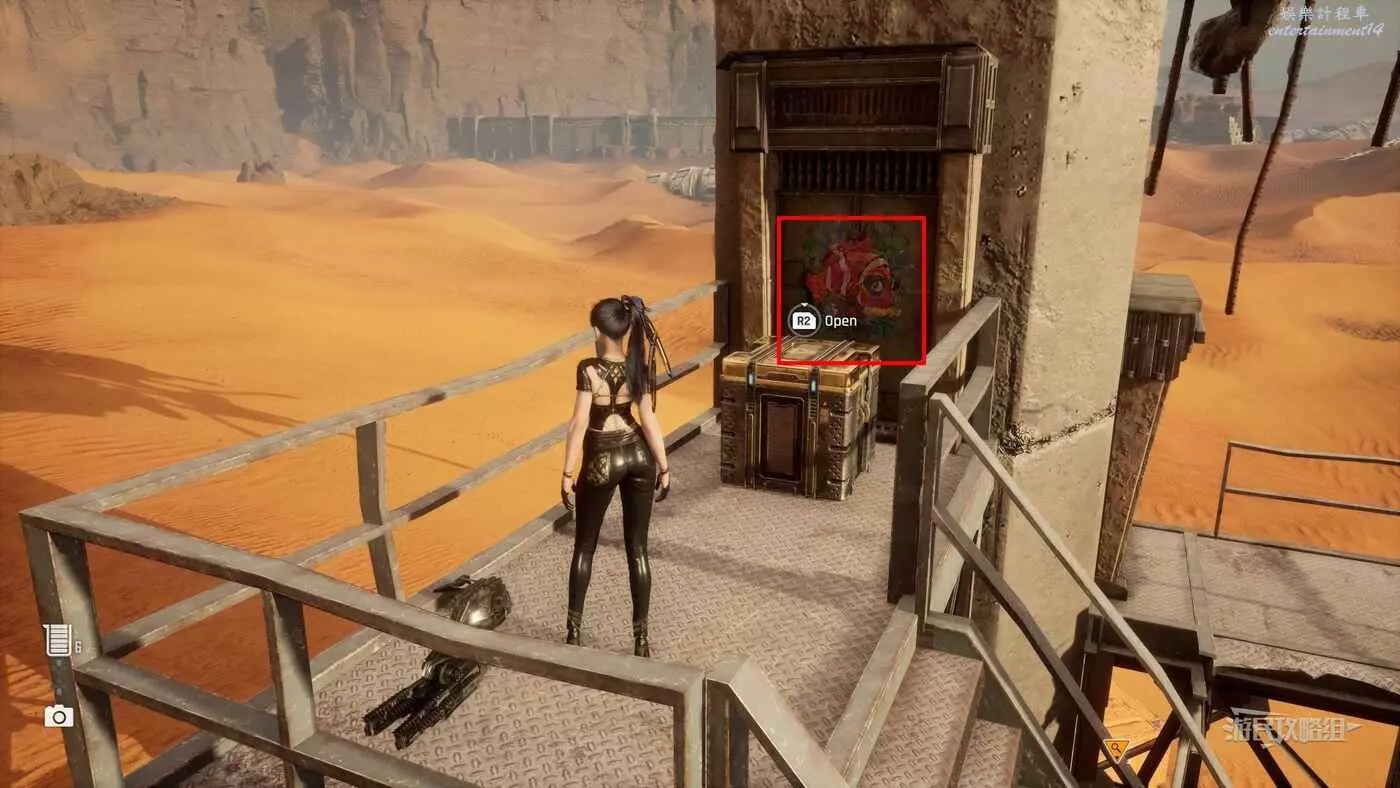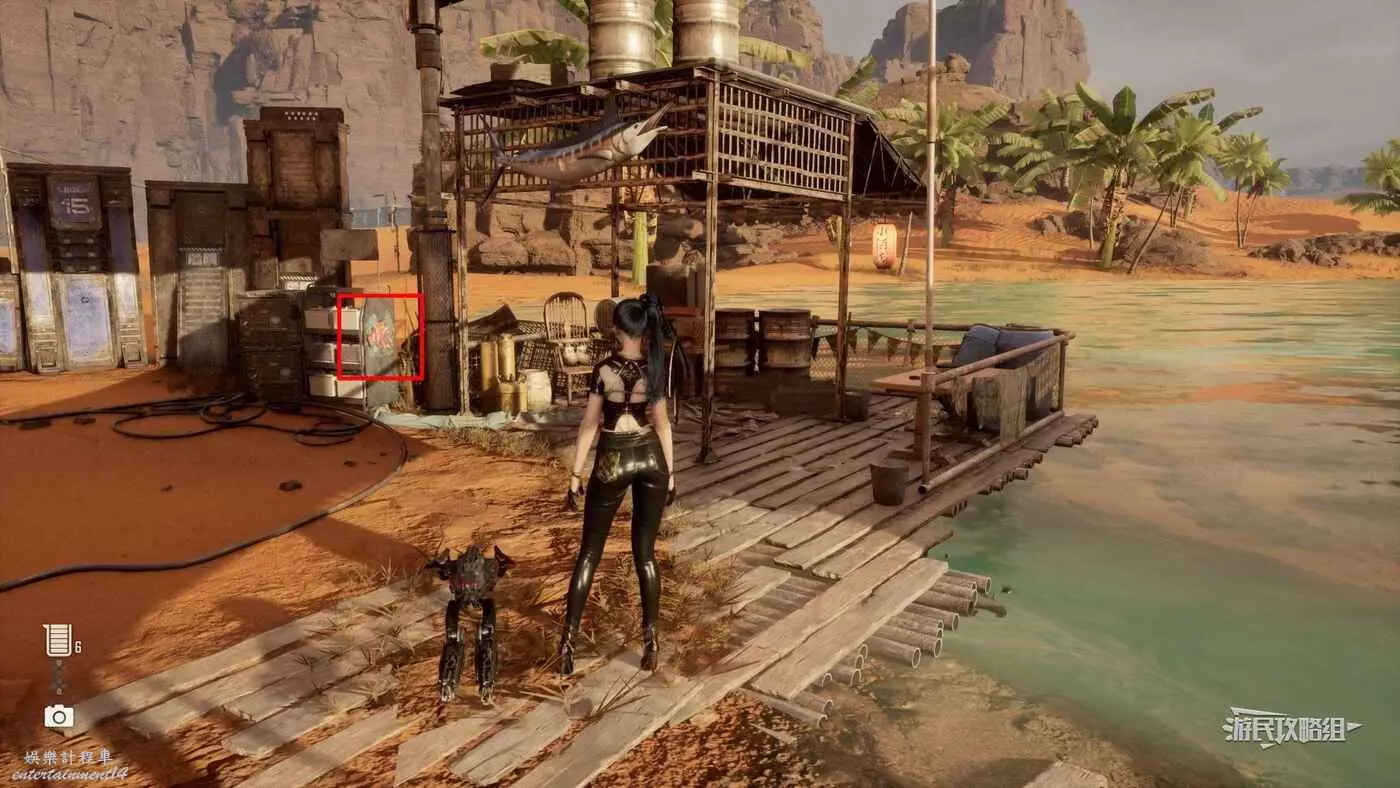 在大沙漠地圖西南側,這裡有巨大的圍牆,從升降攀爬點移動到高處,然後利用蕩杆和無人機平台一路到達平一側的金屬架子平台上,站在平台上與牆上的機關互動開門,進門爬梯子到下層,在床頭的牆上就能看到這條魚。
