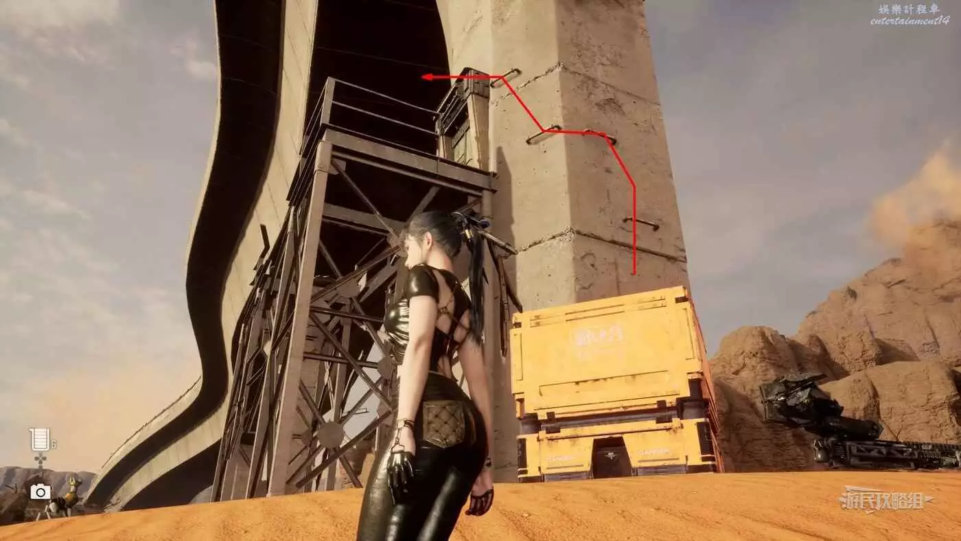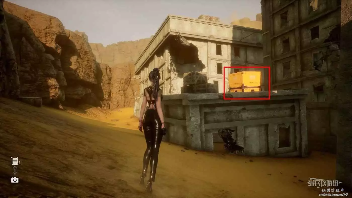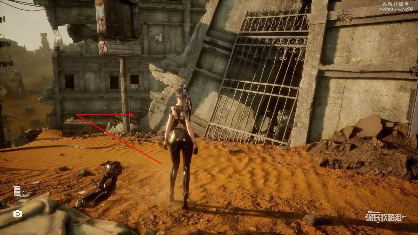 在大沙漠佈滿殘骸的入口營地東邊的全是建築廢墟的區域,前往此區域的東北角,有一棟比較矮的建築廢墟,屋頂上有個黃色大箱子,將這個箱子移動到對面建築的攀爬點附近,利用箱子跳上對面建築牆上的攀爬點,然後使用蕩杆和梯子跳到斜對面建築的屋頂,走屋頂上斜搭的木板再爬兩根蕩杆,第二根蕩杆會斷掉,掉落到下層立刻抓住蕩杆,繼續沿著下層的蕩杆往前移動到前方建築廢墟上,往左看,魚就在斷牆上。