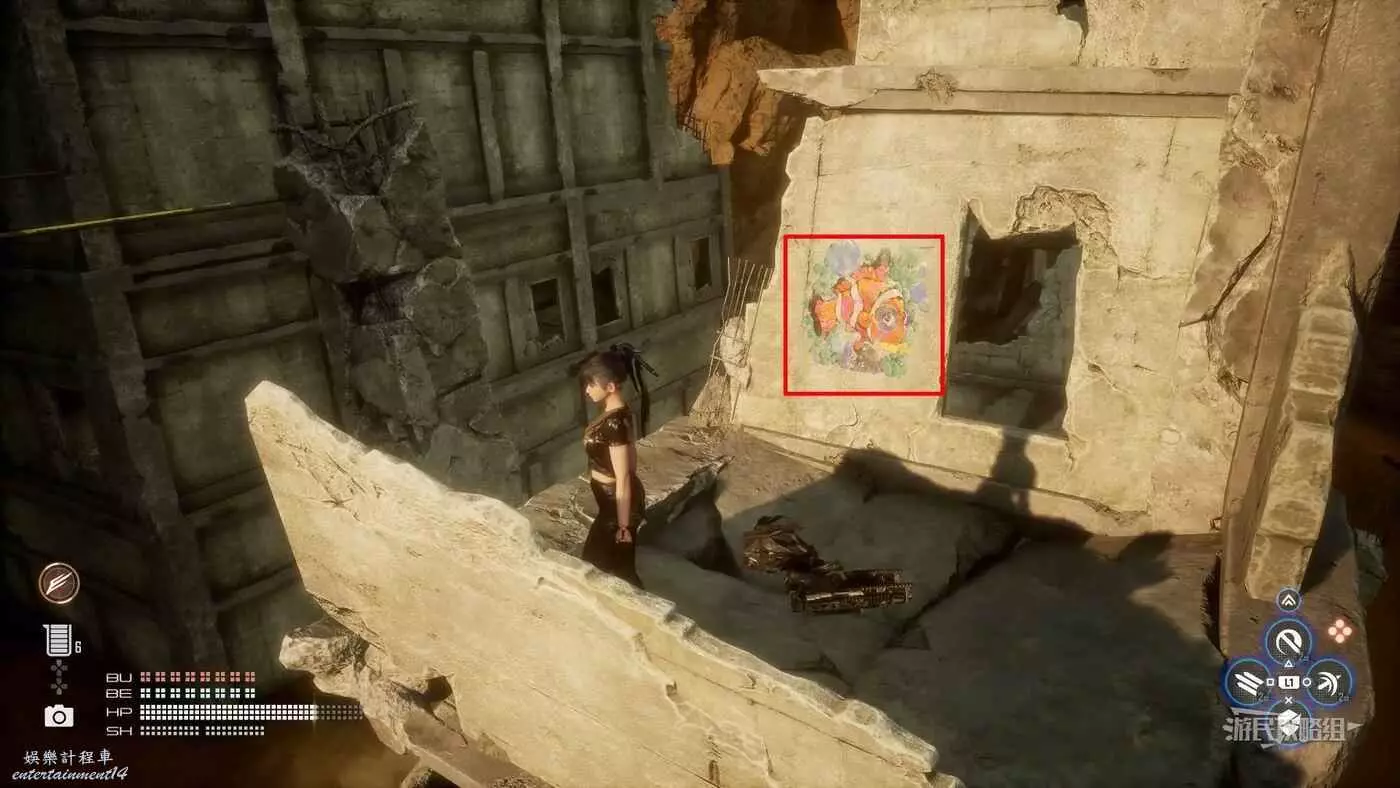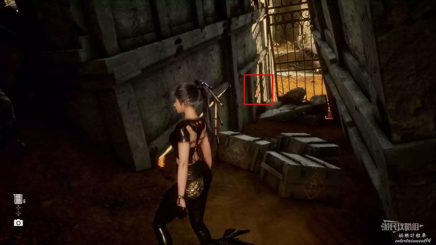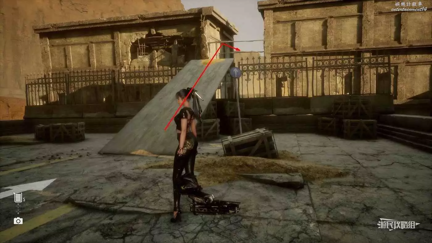 在大沙漠佈滿殘骸的入口營地東邊的全是建築廢墟的區域,前往此區域的東北角,有一棟比較矮的建築廢墟,屋頂上有個黃色大箱子,將這個箱子移動到對面建築的攀爬點附近,利用箱子跳上對面建築牆上的攀爬點,然後使用蕩杆和梯子跳到斜對面建築的屋頂,走屋頂上斜搭的木板再爬兩根蕩杆,第二根蕩杆會斷掉,掉落到下層立刻抓住蕩杆,繼續沿著下層的蕩杆往前移動到前方建築廢墟上,往左看,魚就在斷牆上。