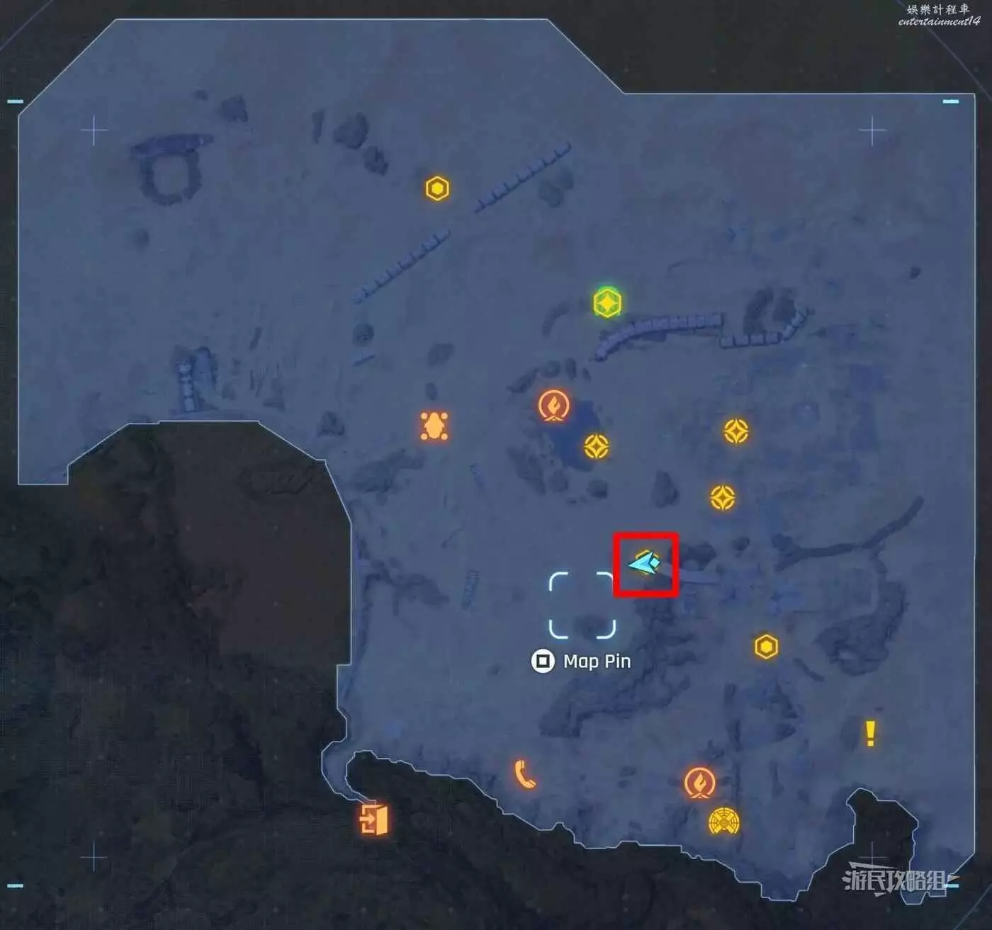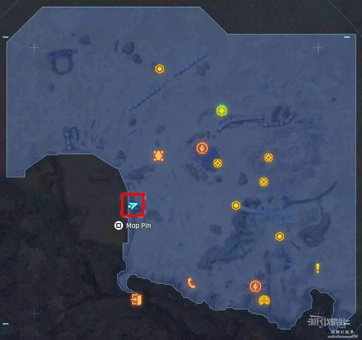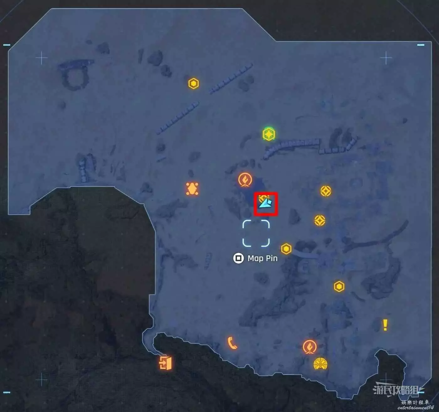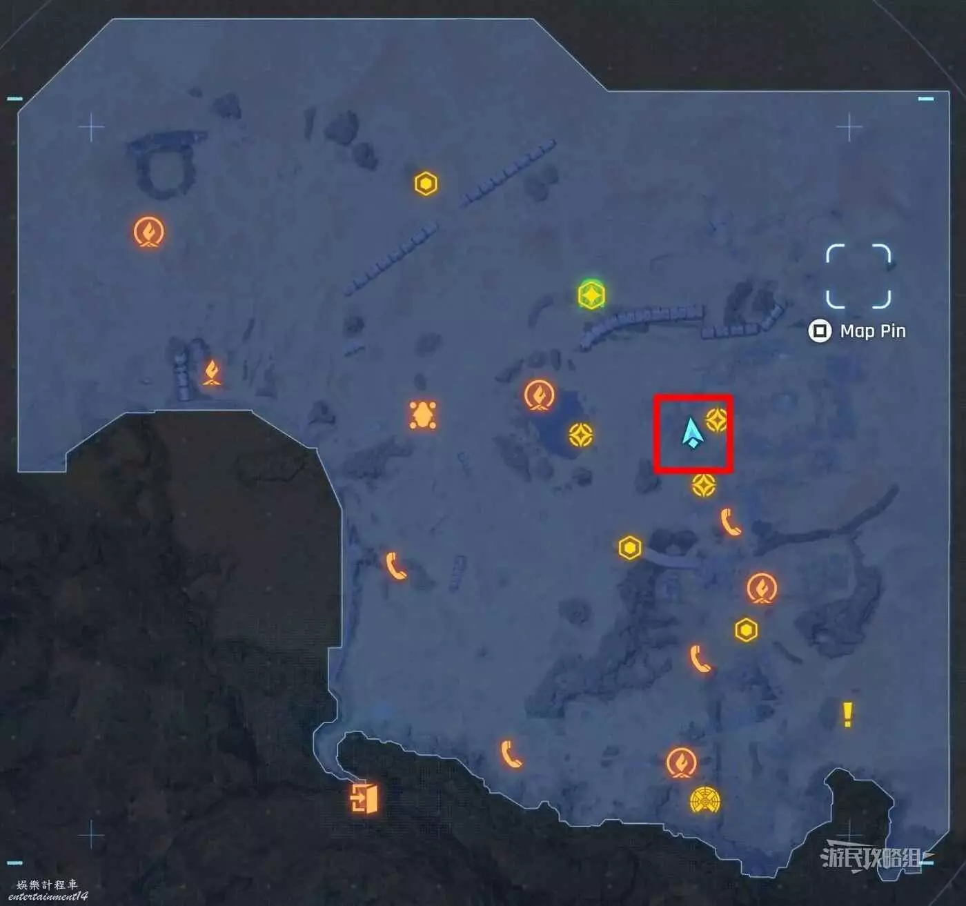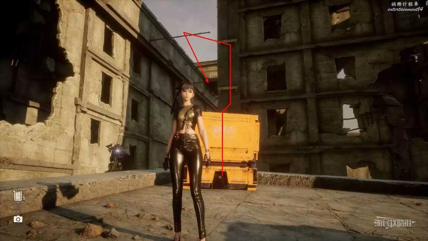 在大沙漠掩埋的廢墟(北)營地往南方向走一點,參考下方地圖所示位置,可以看到一輛巴士、一個梯子還有一個紫色箭頭霓虹燈牌(箭頭向上指),在這些東西對面的建築廢墟中有一根繩索,利用繩索爬到上層平台就能看到這條魚。