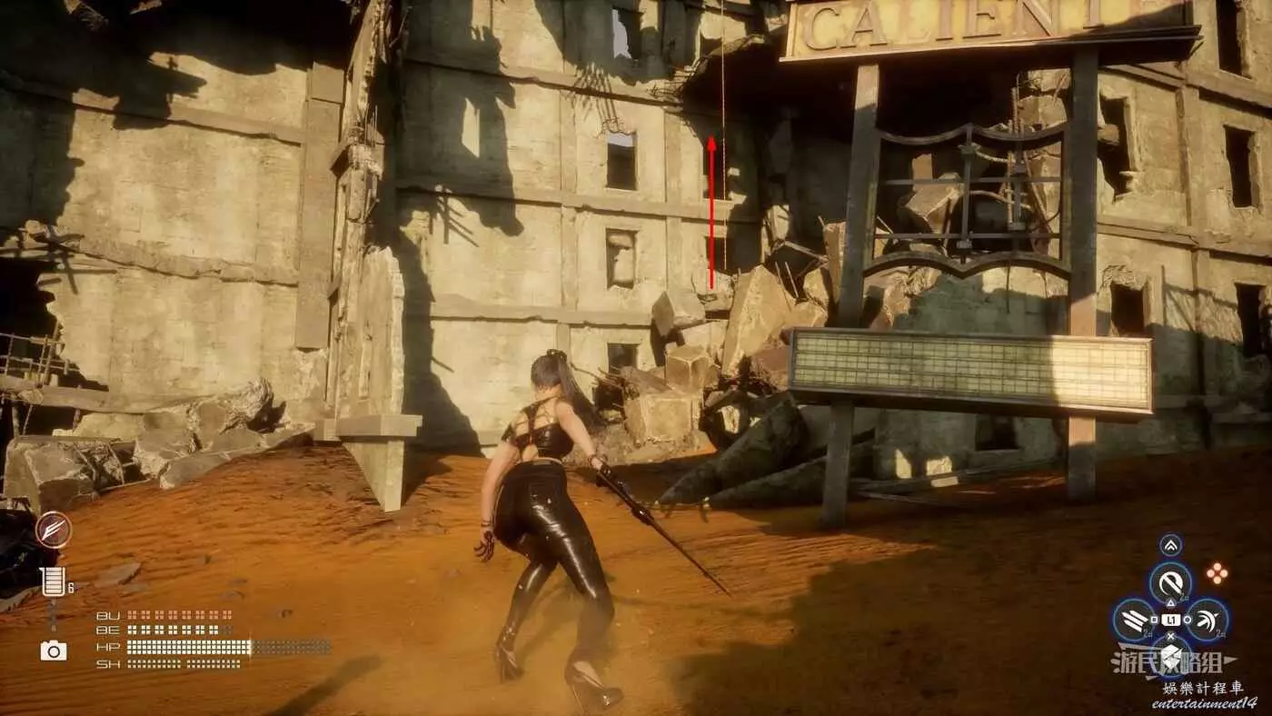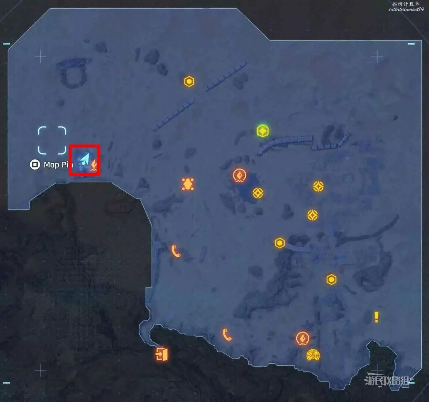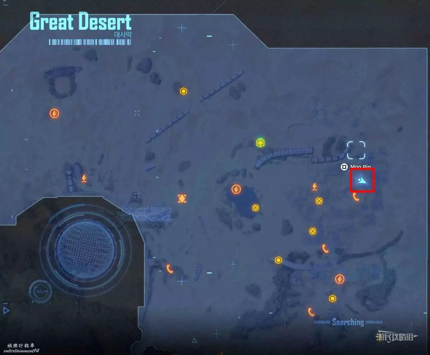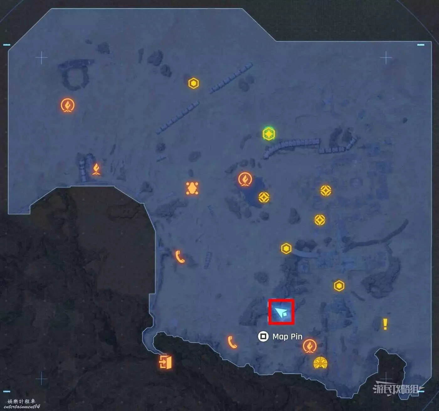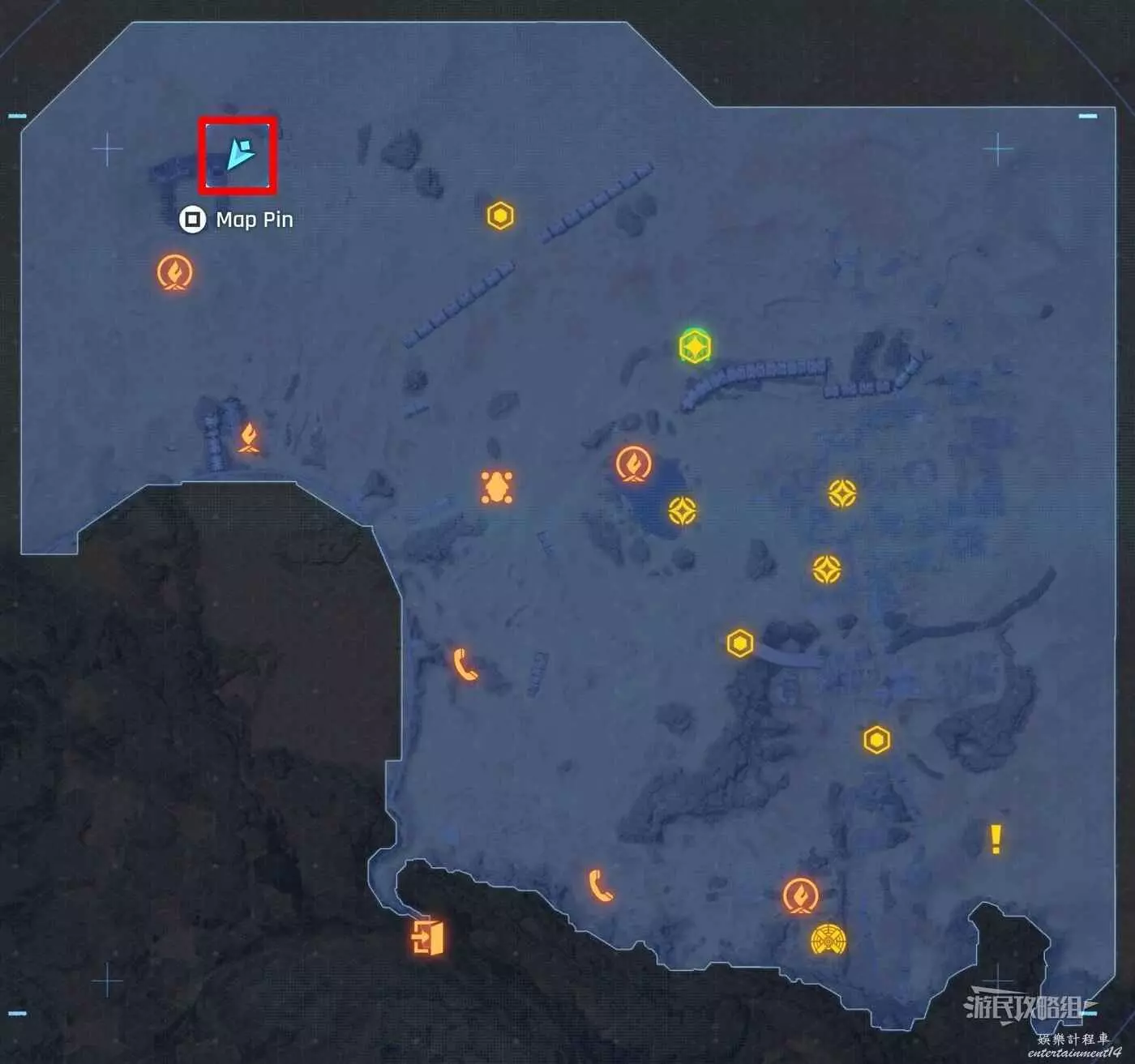 在大沙漠掩埋的廢墟(北)營地往南方向走一點,參考下方地圖所示位置,可以看到一輛巴士、一個梯子還有一個紫色箭頭霓虹燈牌(箭頭向上指),在這些東西對面的建築廢墟中有一根繩索,利用繩索爬到上層平台就能看到這條魚。