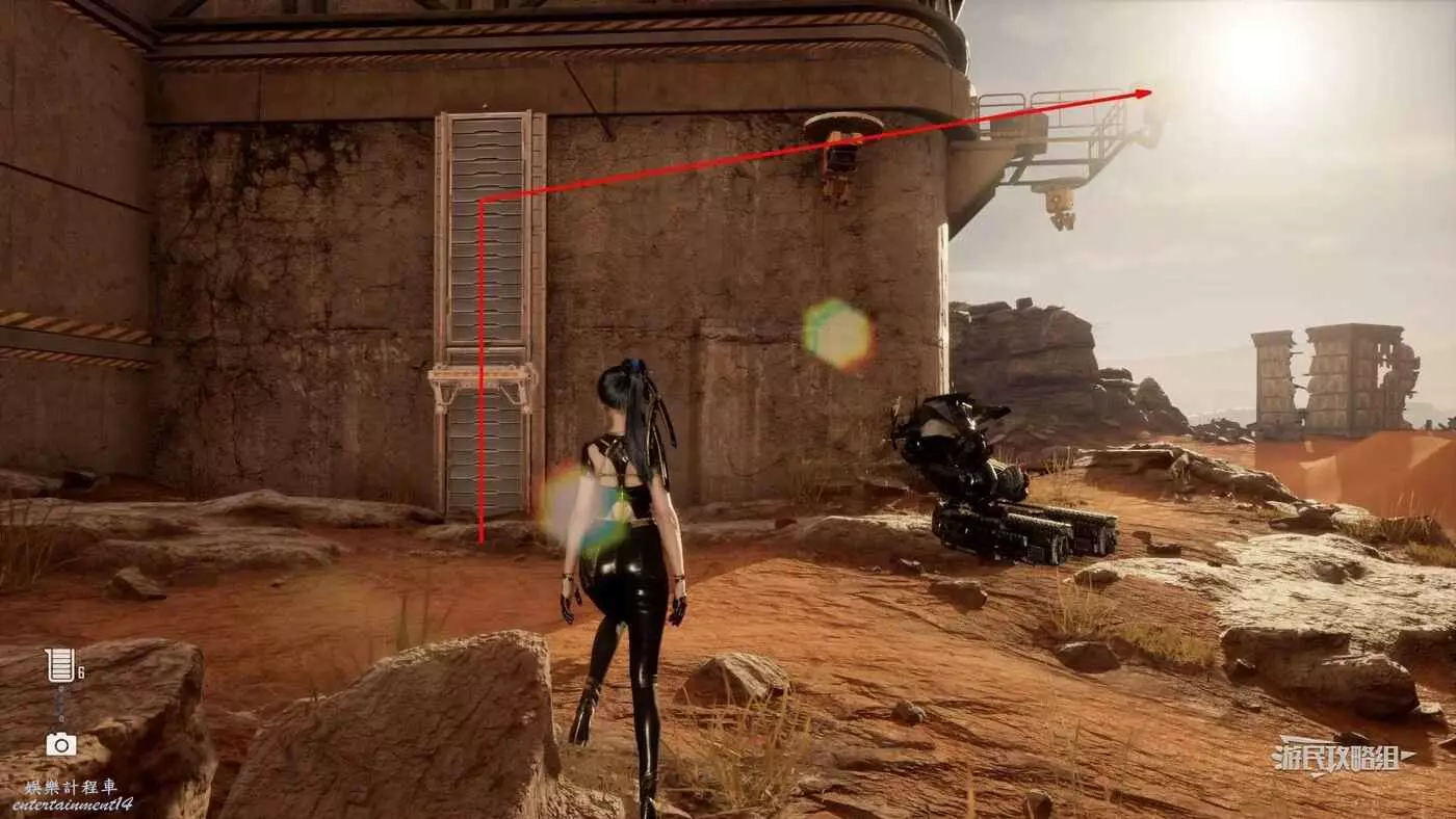 位於大沙漠的日光塔西北邊的巨大岩壁上,在下層可能拍不到,可以從岩壁右側(參考下圖紅色箭頭指引)的小路爬到上層去拍。