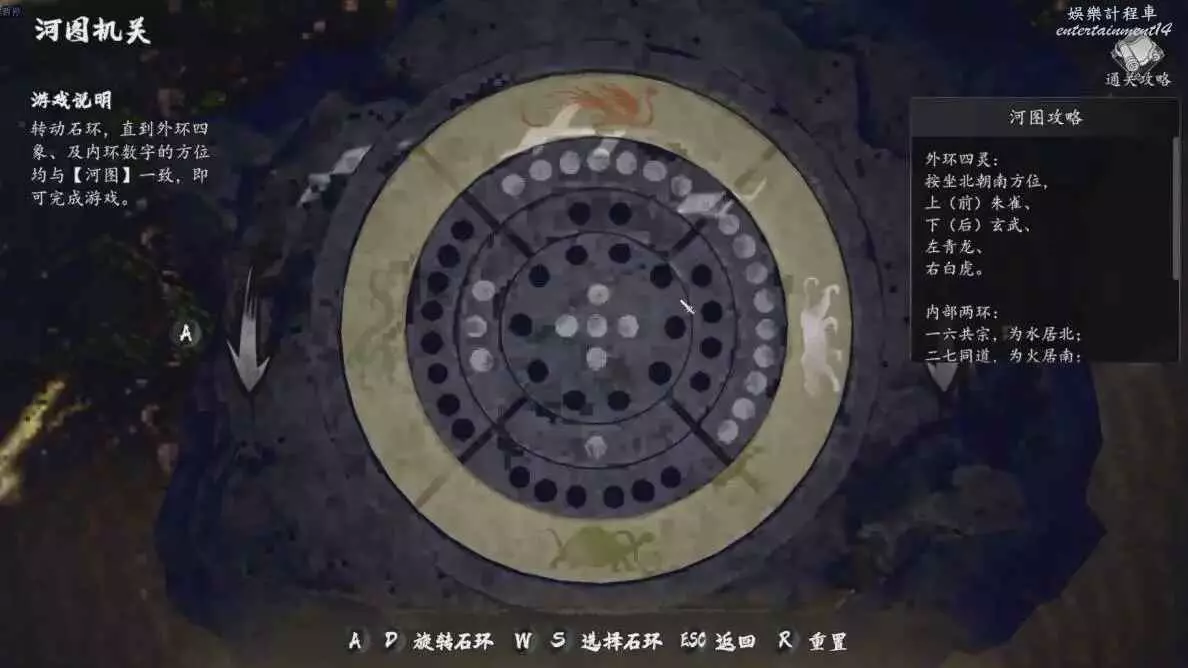 提示了,先將朱雀放南方(上面),並且右上角也說了,二七同道,為火居南,所以二七也在上面。那麼只需要把朱雀轉到最上面,再轉第二圈把七轉到最上面,雖然第二圈會帶動最外圈,但是第二圈轉完,再把最外圈轉好就解開了,並不難。