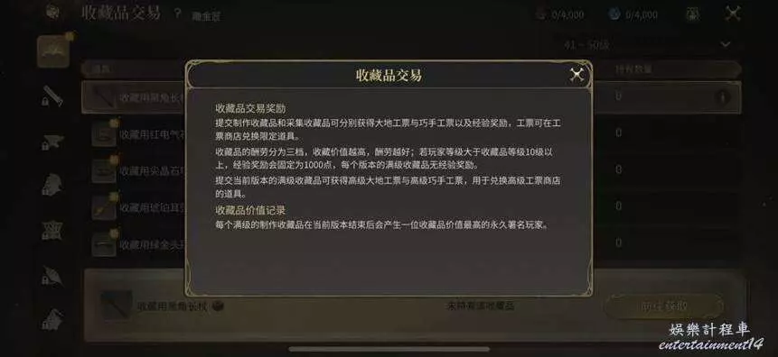 2,收藏品交易:任意生產職業到達40級,並完成任務“一流工匠的新工作”後解鎖。交納收藏品可以獲得經驗和工票,工票可以交換生產職業50級裝備。