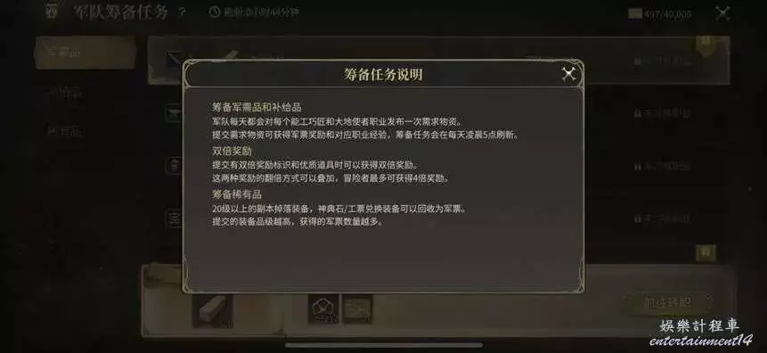 4,籌備任務:每天淩晨5點刷新,提交軍隊所需物品可以獲得經驗和軍票,軍票可以兌換一些時裝和前文提到的軍用指南。