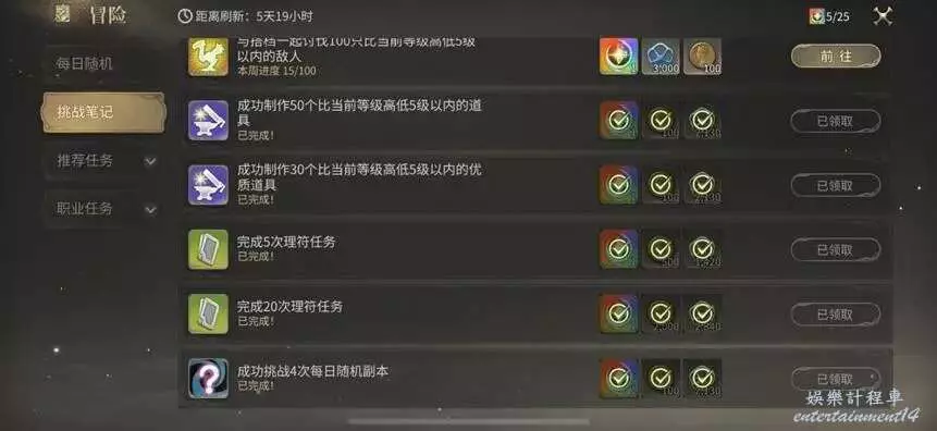 最後,每週更新的挑戰筆記中既可以通過挑戰每日隨機和臨危受命獲取戰鬥職業的額外經驗,還能通過製作、採集、釣魚、完成理符獲取生產職業的額外經驗,更新前記得查看一下是否已經領取。
