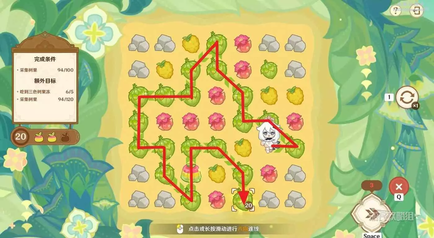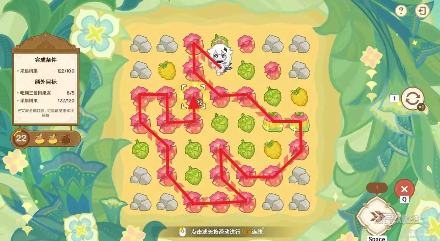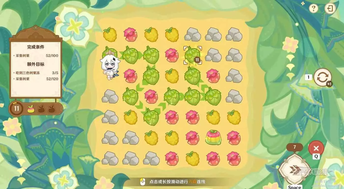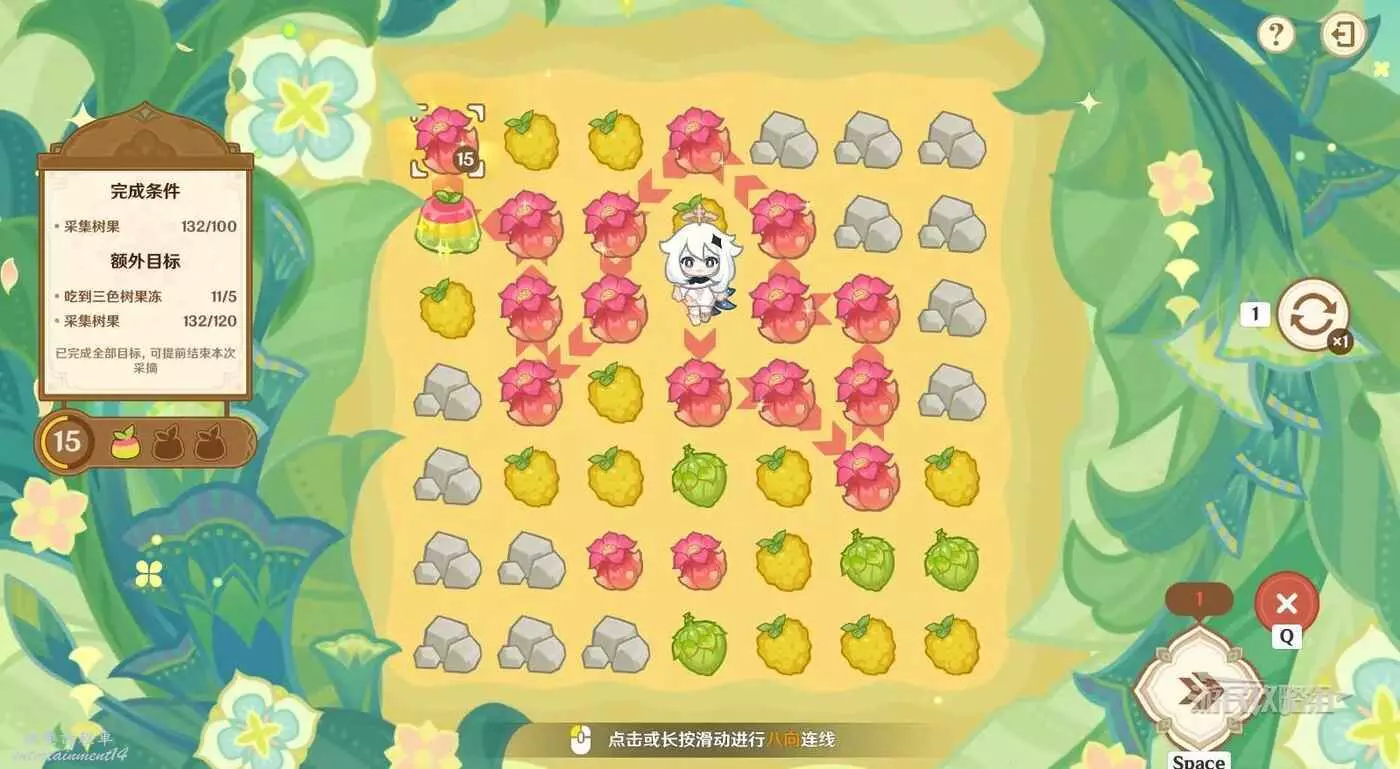 ※由於只有開局固定,後續追加的樹果顏色均為隨機,因此本文僅提供滿獎勵通關思路,答案不唯一。完成目標之後可以提前結束關卡,記得合理運用採集道具來更換不理想的板面。