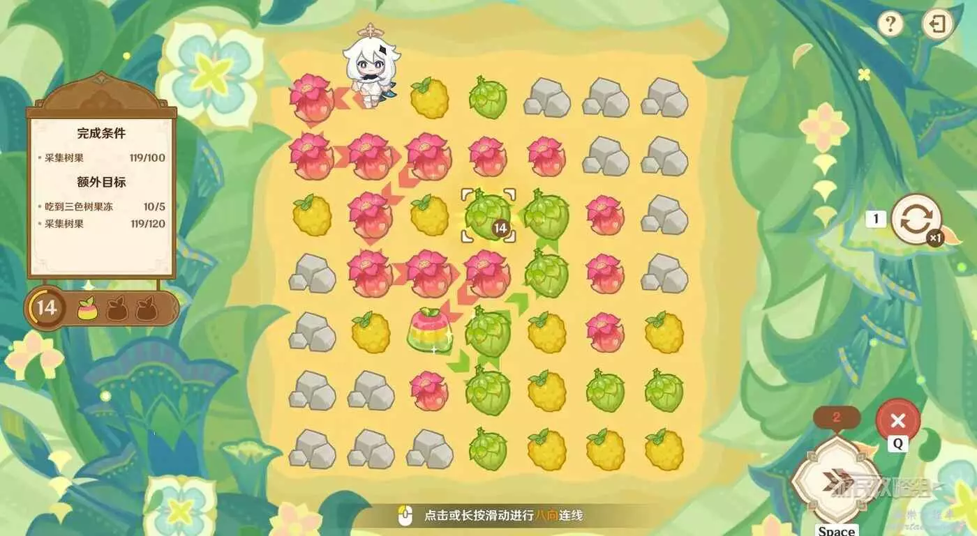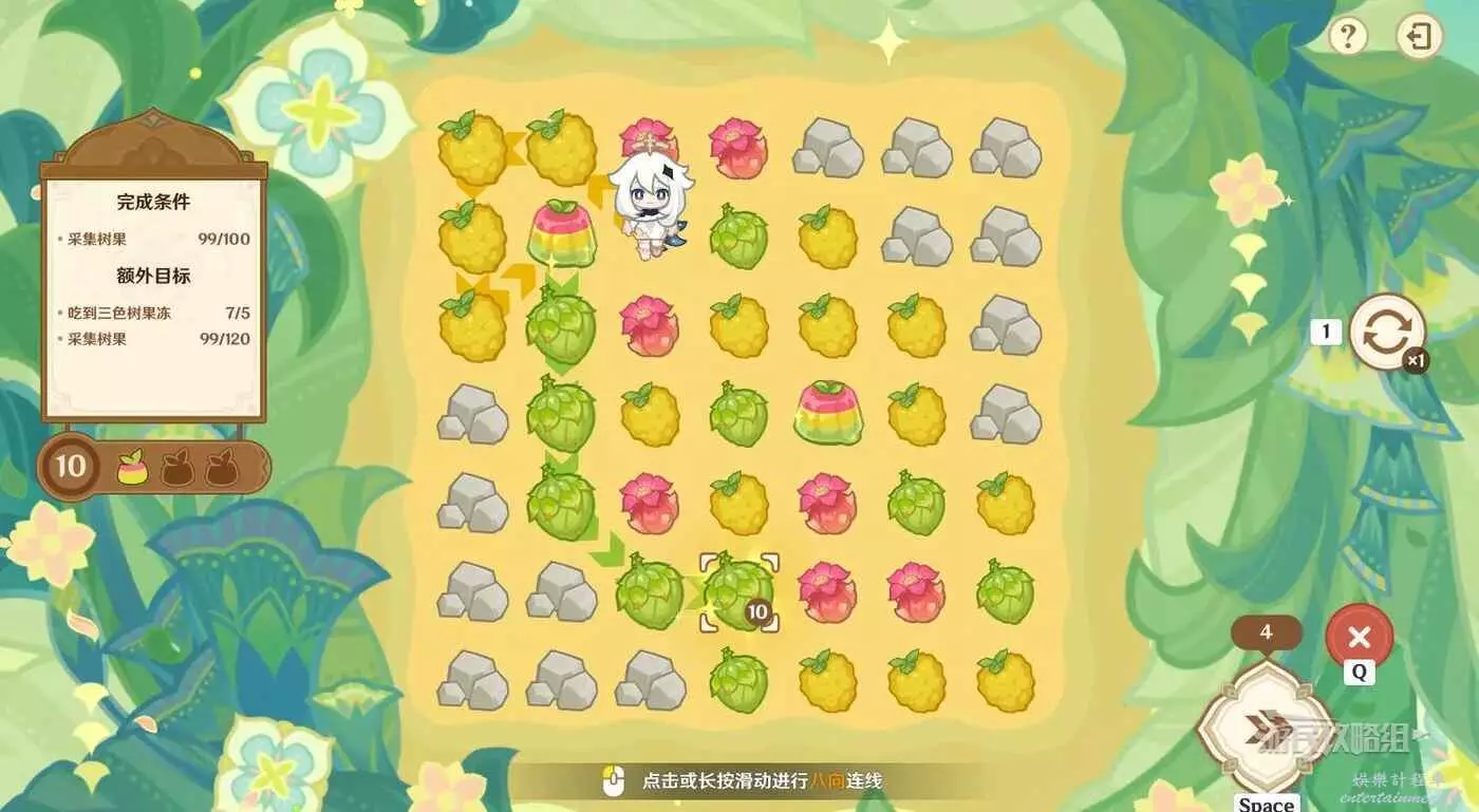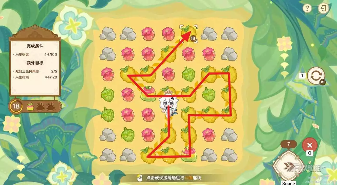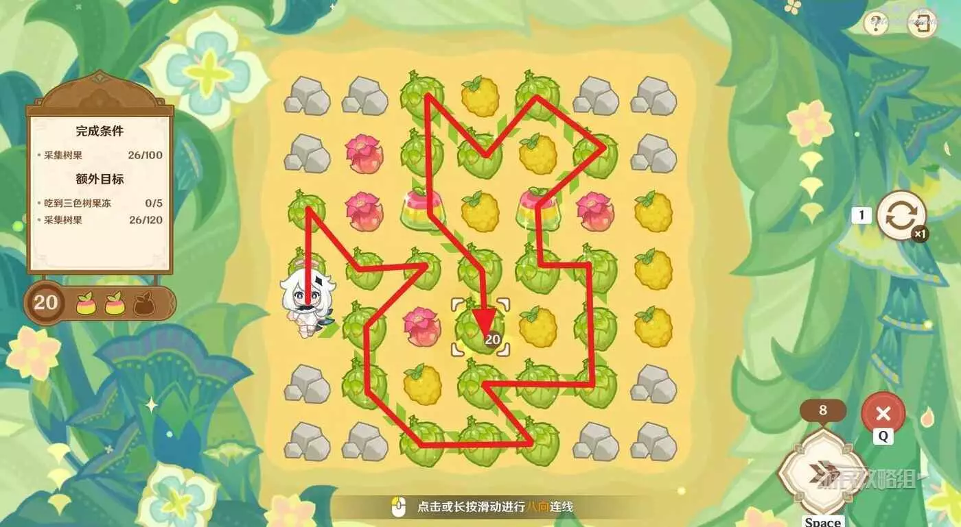※由於只有開局固定,後續追加的樹果顏色均為隨機,因此本文僅提供滿獎勵通關思路,答案不唯一。完成目標之後可以提前結束關卡,記得合理運用採集道具來更換不理想的板面。